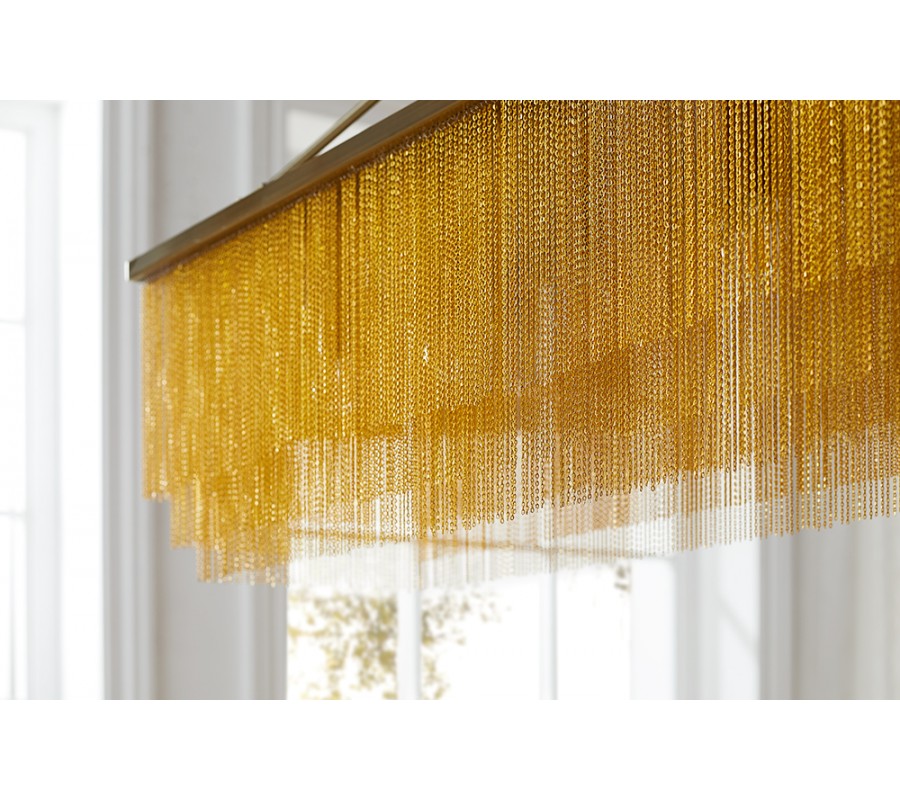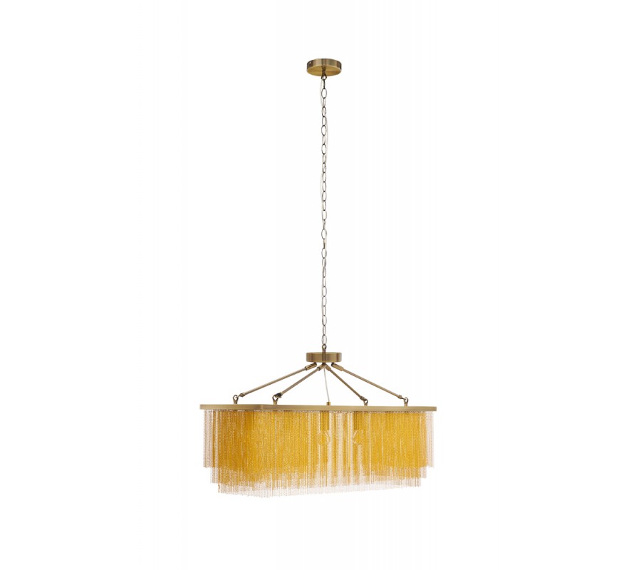 Luster Odilon prežiari váš interiér leskom a luxusom. Spája v sebe nádhernú zlato žltú metalickú farbu a jedinečný retiazkový dizajn tienidla.