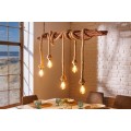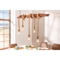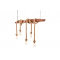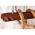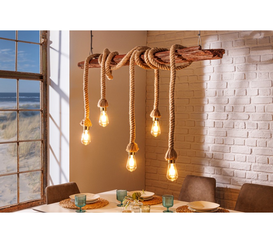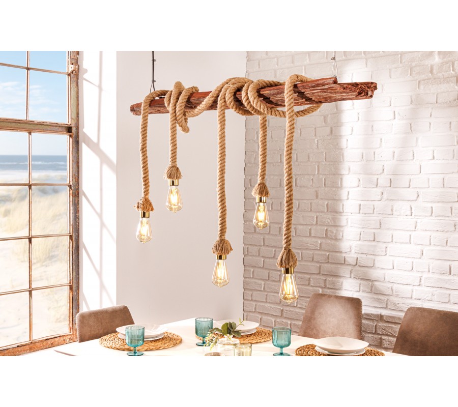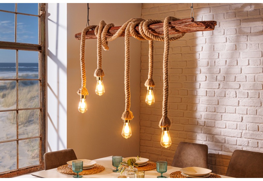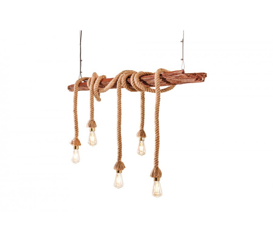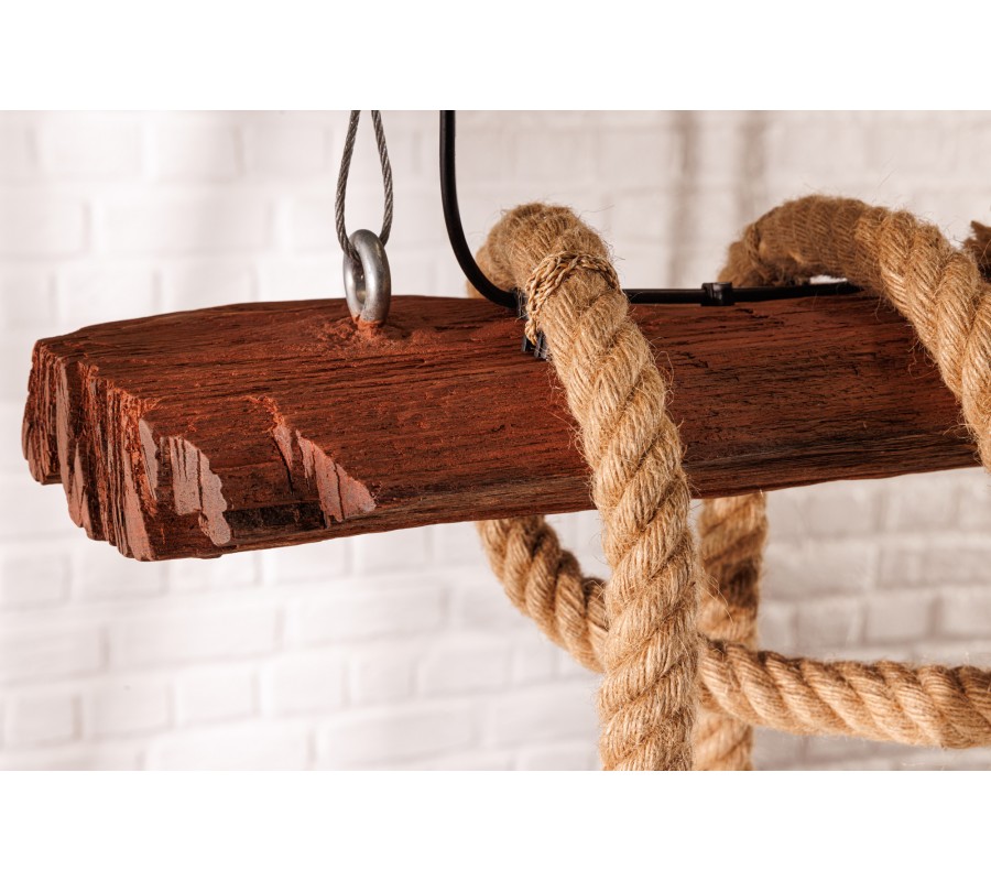 Luster je zavesený na dvoch prívodných kábloch s dĺžkou 120 cm. Centrálnym prvkom dizajnu je obdĺžnikový kus masívneho dreva s výraznou naturálnou štruktúrou. Má prírodnú, teplú hnedú farbu a tento materiál výborne dopĺňa svetlohnedé hrubé lodné lano so špirálovým zatočením. Lano je nepravidelne omotané okolo dreva a na jeho koncoch sa nachádza päť objímok na žiarovky.