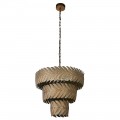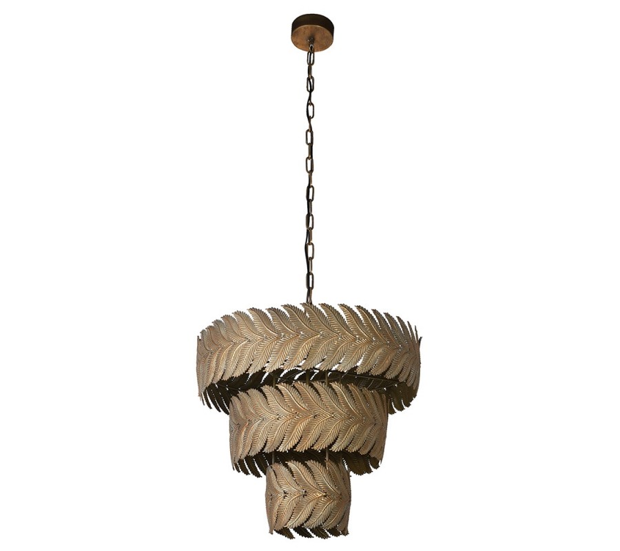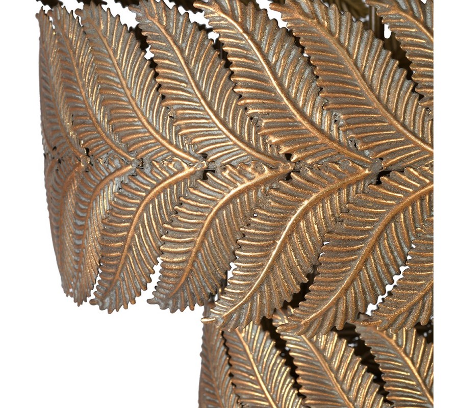 Svietidlo je vyrobené z kovu. Má zlatú farbu a jeho povrch je upravený jemnou patinou, ktorá mu dodáva šarmantný vintage vizuál. Dizajnu dominuje okrúhle tienidlo s tromi úrovňami. Ich priemer sa smerom dole zmenšuje a odvod zdobia tri obruče zdobené hustými papraďovými listami.