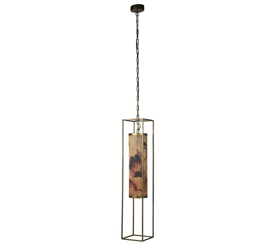 Konštrukcia svietidla je vyrobená z kovu. Na retiazke, cez ktorú je prepletený aj prívodný kábel, visí dlhý lineárny rám so štvorcovým pôdorysom, ktorý tvoria štíhle valcovité línie, vymedzujúce jeho hrany. Kovové časti majú zlatú farbu a ich povrch pokrýva jemná patina, tlmiaca kovový lesk. Tento efekt dodáva lampe pôvabný starožitný charakter, ktorý skvele korešponduje s florálnym vzorom tienidla.