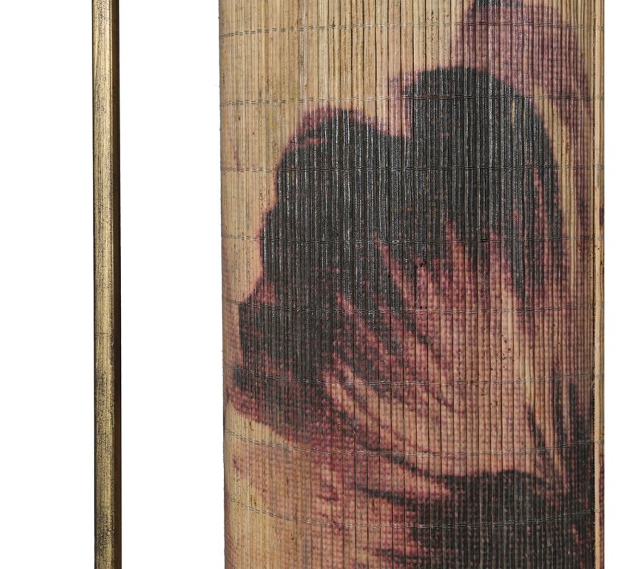 Tienidlo je tvorené tenkou pletenou rohožou z bambusového vlákna. Je natiahnutá medzi dvomi kruhovými kovovými obručami. Výplet má naturálnu svetlú hnedú farbu a zdobí ho organický vzor kvetov v odtieňoch červenej. Pôvabné akvarelové maľby s florálnym motívom a bambus dodávajú svietidlu nádych japonského dekoratívneho umenia.
