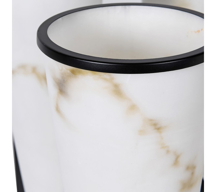 Tienidlá majú bielu farbu a zdobí ich naturálne kamenné žilovanie v svetlej hnedej farbe, ktoré vynikne v plnej kráse po zažatí svetla. Sú vyrobené zo živice, ktorá autenticky zachytáva luxusný alabastrový vizuál, vrátane jeho jedinečnej priesvitnosti.