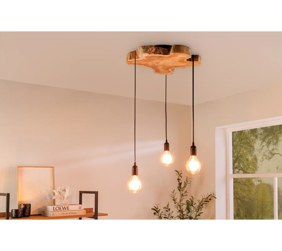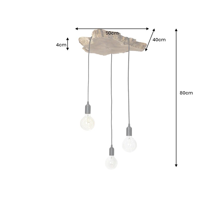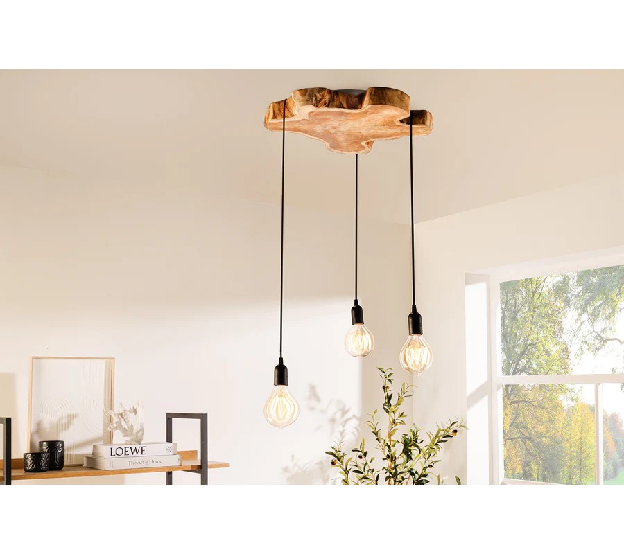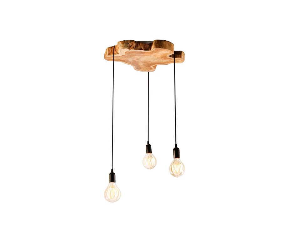 Dizajnový industriálny luster Hypnotic s prvkom z hnedého masívneho dreva longan a tromi visiacimi žiarovkami 80 cm