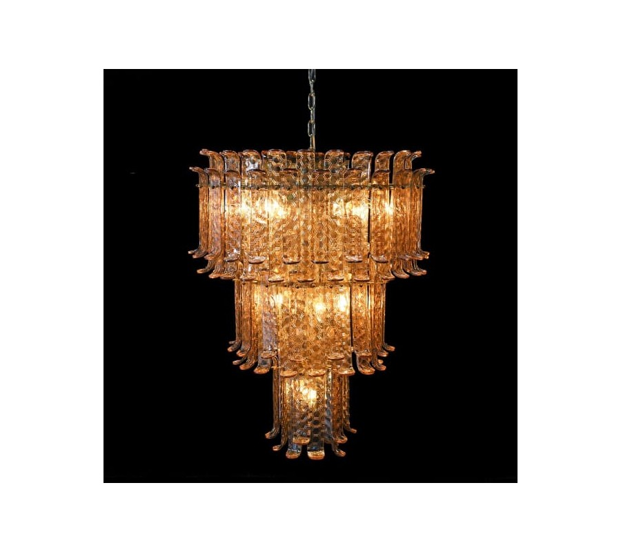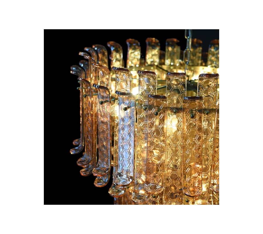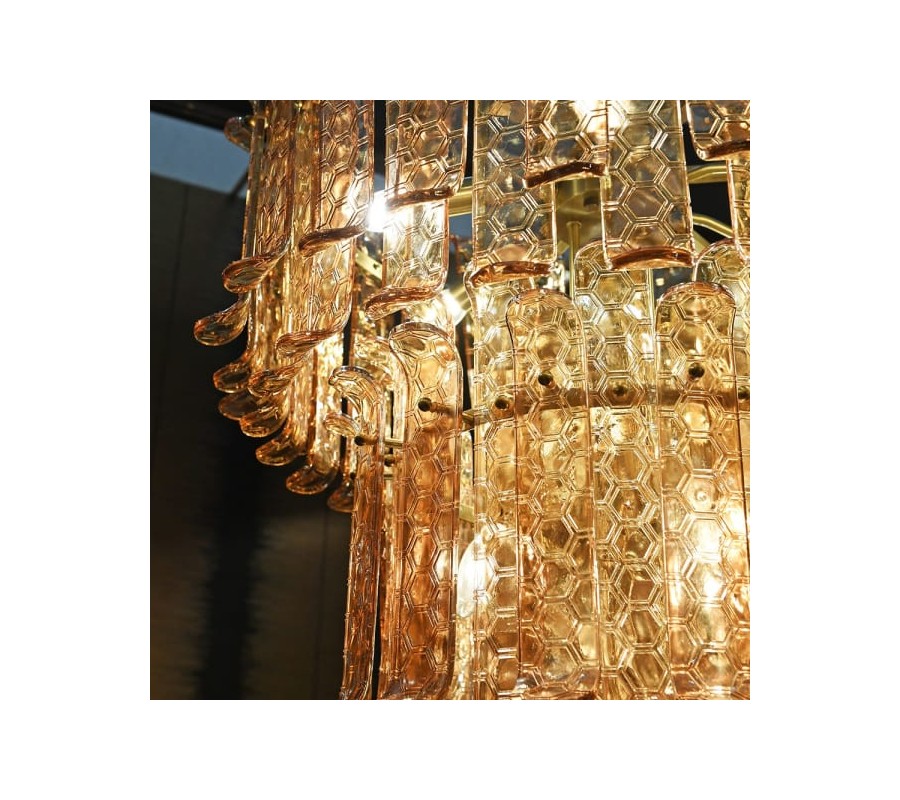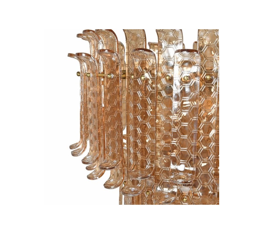 Elegantný luster Melinda vyniká svojím kaskádovitým tvarom a sofistikovaným dizajnom, ktorý kombinuje jemné farebné tóny so štruktúrovanými materiálmi. Jeho konštrukcia je vytvorená z viacerých vrstiev sklenených elementov s jemným nádychom medovej farby, ktoré dodávajú lustru teplý a luxusný vzhľad. Sklenené časti majú hladký a lesklý povrch so vzorovanou textúrou včelých úľov, ktorá zachytáva a rozptyľuje svetlo, čím vytvára zaujímavú hru odleskov a jemnú atmosféru.