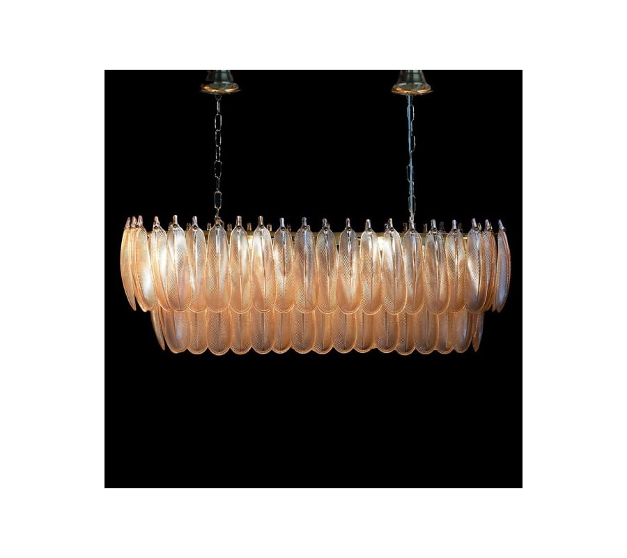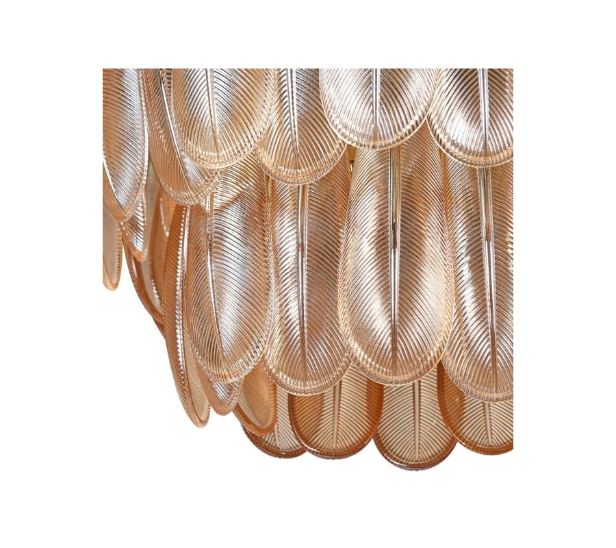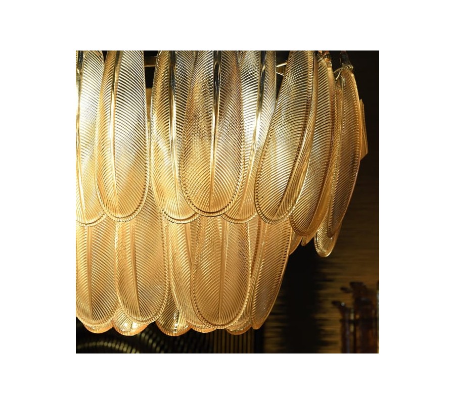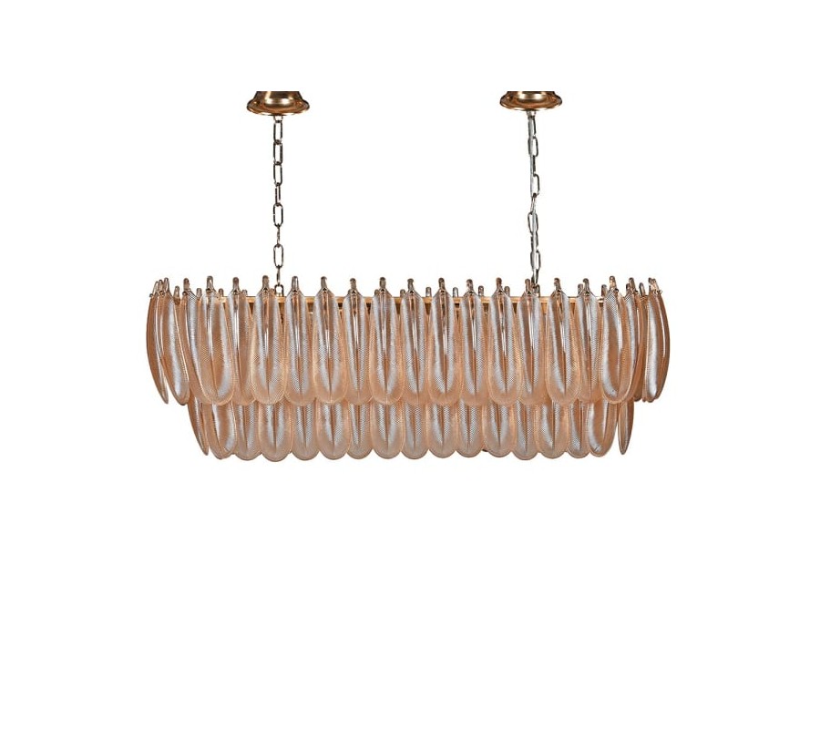 Elegantný luster Hendy má horizontálne predĺžený oválny tvar, ktorý pôsobí vzdušne a sofistikovane. Jeho konštrukcia je vytvorená z pevného kovového rámu vo farbe zlata, na ktorom sú zavesené vertikálne sklenené elementy v jemne hnedastej až zlatej farbe. Sklenené prvky majú predĺžený, zaoblený tvar pripomínajúci pierka, s jemnou textúrou na povrchu, ktorá im dodáva zaujímavý detail a zvýrazňuje odlesky svetla.