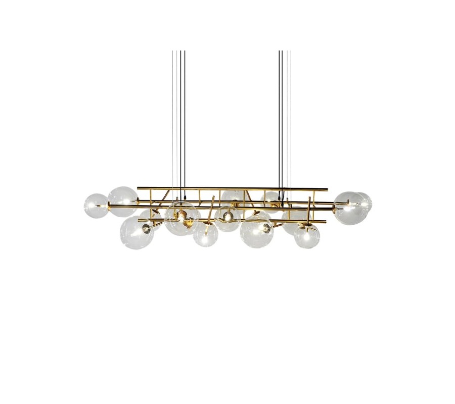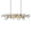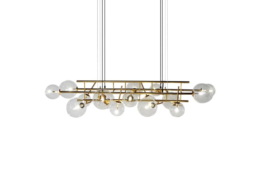 Moderný luxusný luster Albi predstavuje dizajnový skvost s unikátnou konštrukciou a elegantným vzhľadom. Luster má podlhovastý tvar a je tvorený komplexnou kovovou štruktúrou v zlatej farbe, ktorá pozostáva z horizontálne a vertikálne usporiadaných tyčí, pôsobiacich sofistikovane a zároveň vzdušne. Na konštrukcii je osadených 16 sklenených krytov na žiarovky v tvare priehľadných gúľ, ktoré vytvárajú jemný a rozptýlený svetelný efekt.