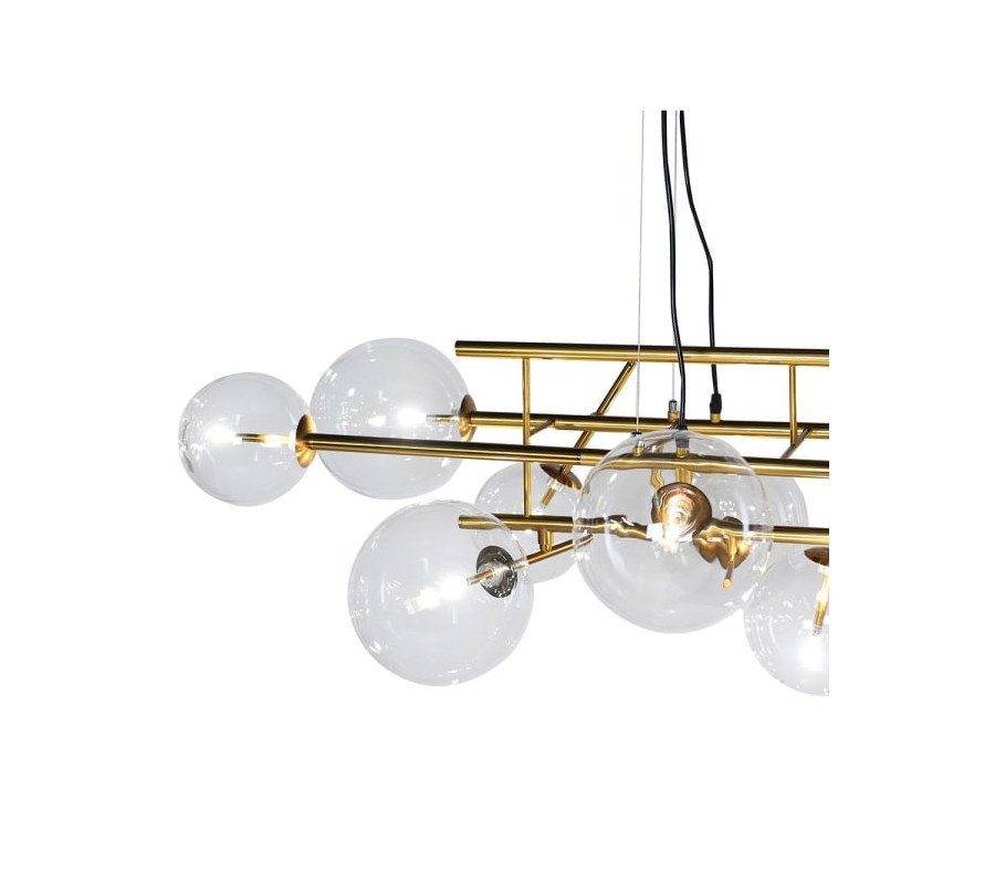 Každá žiarovka je precízne umiestnená tak, aby dodávala lustru dynamiku a estetickú vyváženosť. Priehľadné sklo krytov harmonicky kontrastuje so zlatými detailmi kovovej konštrukcie, čím luster zaujme na prvý pohľad. Kovová konštrukcia je robustná, no pôsobí ľahko, vďaka elegantnému usporiadaniu.