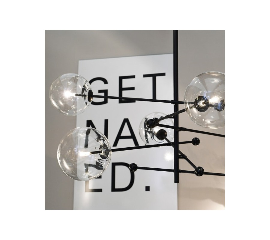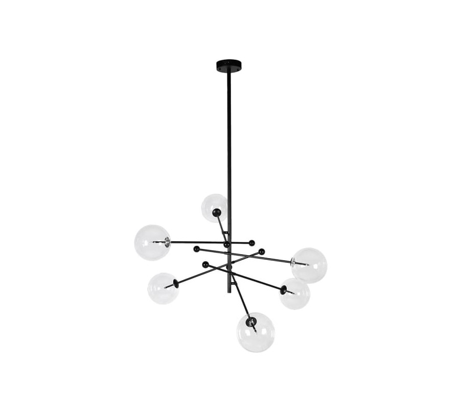 Konštrukcia je vyrobená z kovu a jej čierna farba prináša do dizajnu štýlový industriálny nádych. Vyvažujú ho delikátne sklenené tienidlá, ktoré sú priehľadné a vytvárajú tak kontrastný vizuál krehkosti. Ich guľatý tvar korešponduje s geometrickým charakterom konštrukcie. Je potrebných 6 žiaroviek typu G4, ktoré nie sú súčasťou balenia.