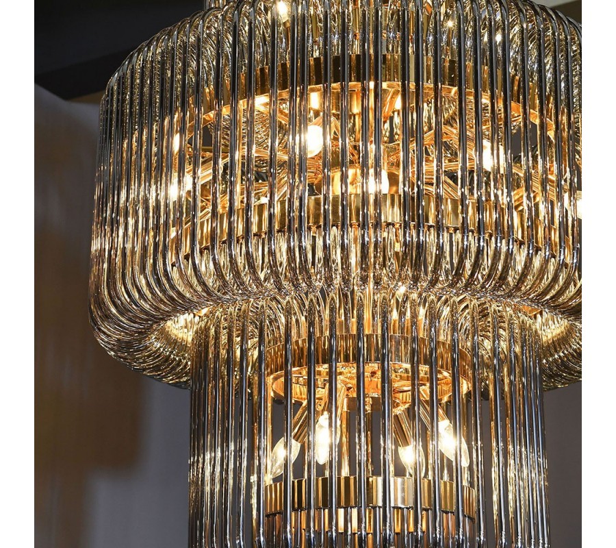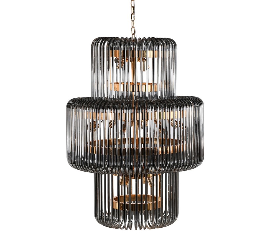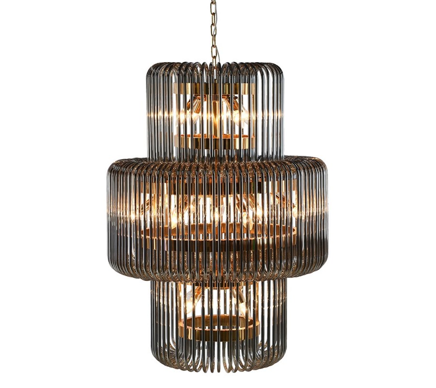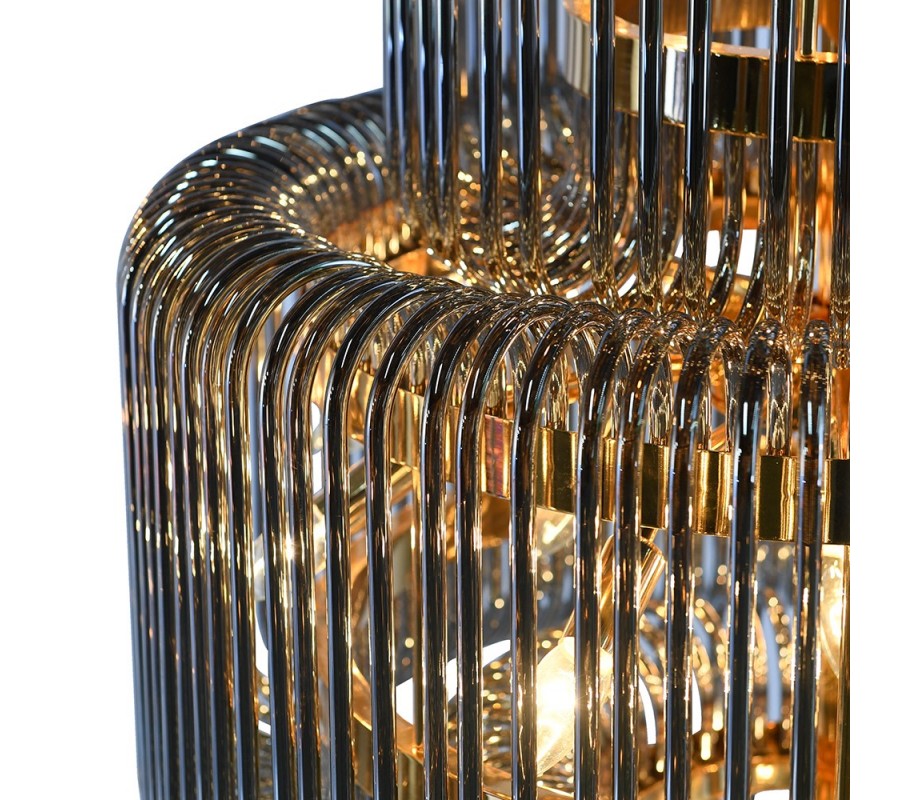 Na vonkajšej strane sa nachádza elegantné trojúrovňové tienidlo, zložené z tenkých ohýbaných sklenených trubíc, ktoré sú umiestnené vertikálne vedľa seba. Sklo má dymový efekt a jeho sivá farba vytvára sofistikovaný kontrast k lesklému zlatému kovu. Stredná úroveň je najširšia a sklenené prvky sú na nej zahnuté na vrchnej aj spodnej časti. Vrchná a spodná úroveň majú menší priemer a dodávajú lustru symetrický geometrický vzhľad.