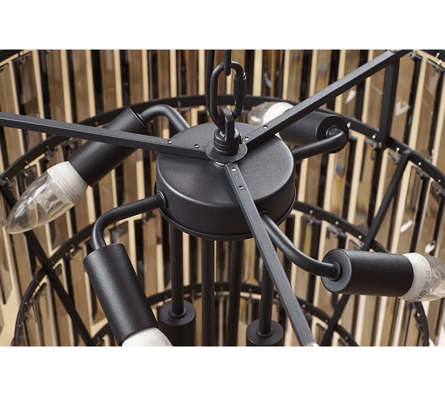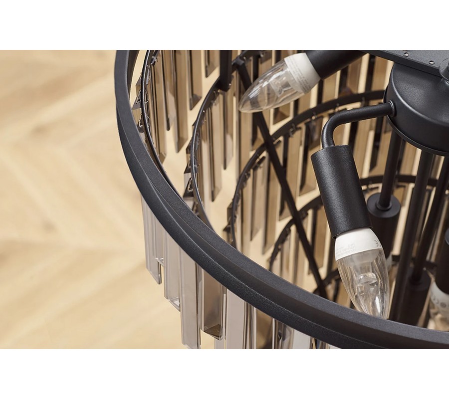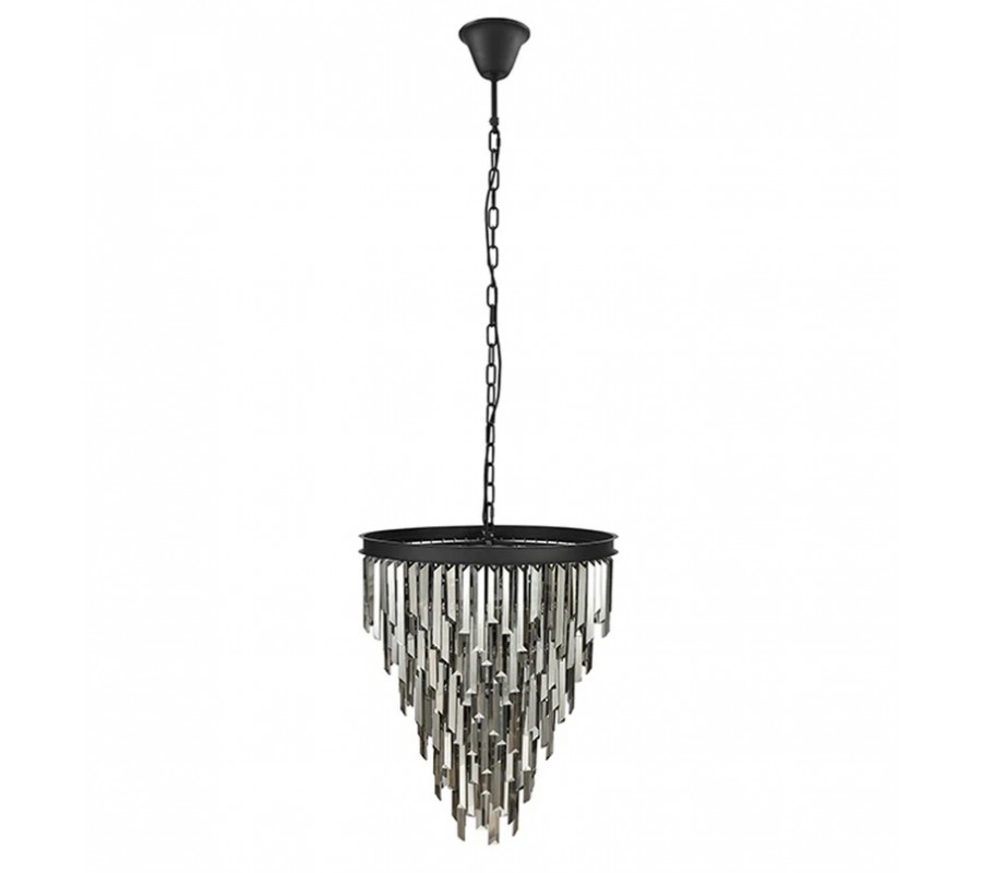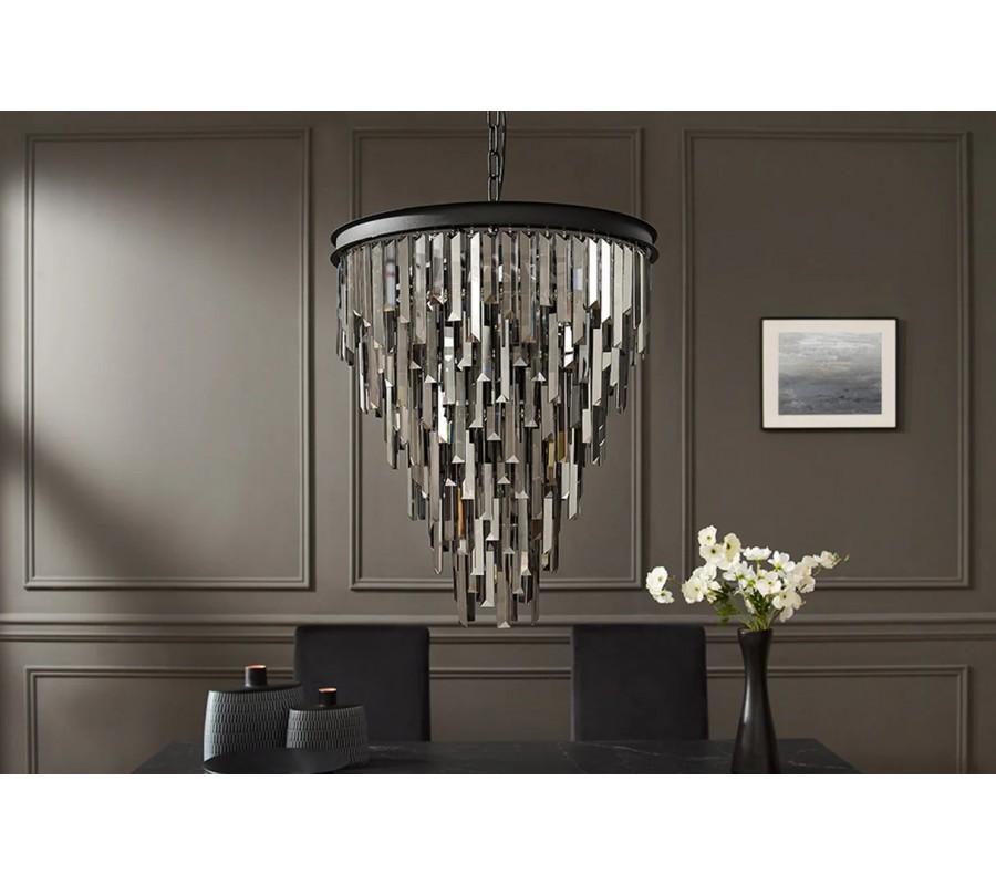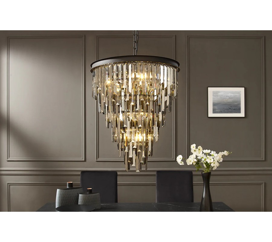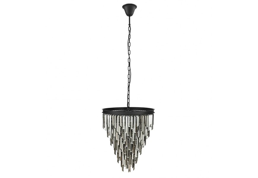 Luxusný luster Cyrilla je v glamour štýle, ktorý okamžite pritiahne pozornosť svojím výrazným vzhľadom a sofistikovaným dizajnom. Okrúhla kovová konštrukcia v tmavosivej farbe je doplnená o niekoľko radov dlhých sklenených dekorácií s geometrickým rezom v jemne dymovom odtieni, ktoré vytvárajú efekt visiacej kaskády. Kombinácia kovu a dymového skla pôsobí elegantne, dynamicky a mimoriadne štýlovo.