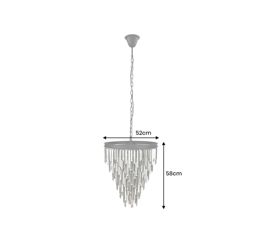 S priemerom 52 cm a výškou 58 cm patrí medzi stredne veľké lustre, ideálny do obývačky, nad jedálenský stôl alebo do vstupnej haly. Dĺžka kábla 105 cm umožňuje pohodlné prispôsobenie výšky zavesenia podľa výšky stropu. Luster Cyrilla je vybavený päticou na žiarovku typu E14 s maximálnym výkonom 25 W, pričom pri použití LED žiaroviek ponúka úsporné, ale stále efektné osvetlenie.