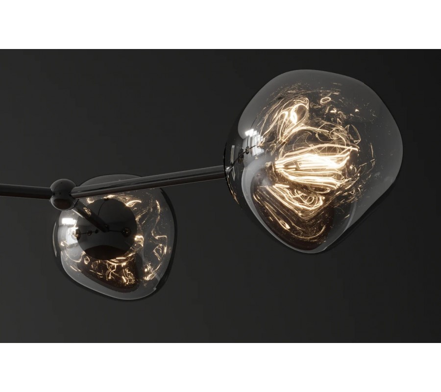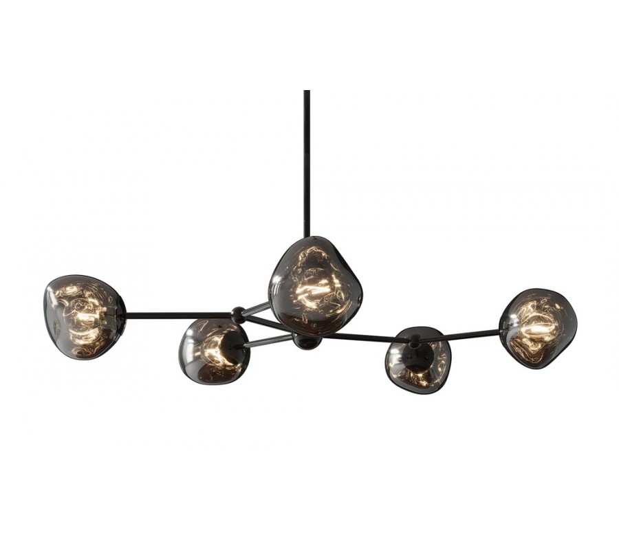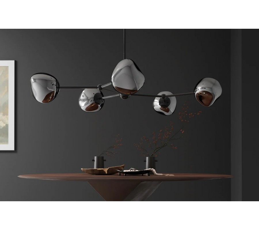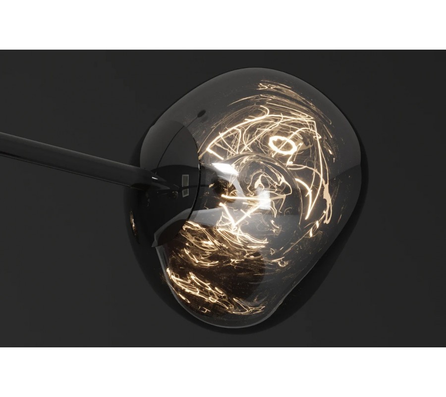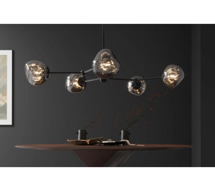 Závesný luster Kalan v čiernej verzii predstavuje pútavý svetelný prvok, ktorý prepája glamour eleganciu s jemne experimentálnym dizajnom. Päť sklenených tienidiel nepravidelného organického tvaru pripomína kvapky tmavej tekutiny alebo roztaveného skla. Ich jemne dymový až čierny tón vytvára pri zažatí svetla efektné odlesky a zlatisté vnútorné reflexy, ktoré dodávajú lustru hĺbku a dramatickú svetelnú atmosféru.