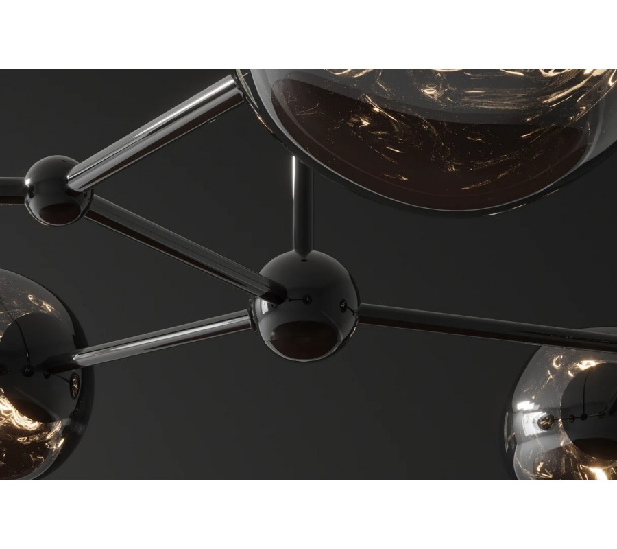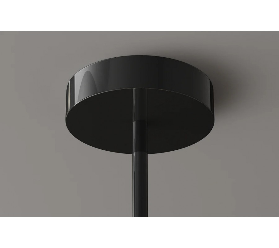 Kovová konštrukcia v matnej čiernej farbe je tvorená niekoľkými vzájomne prepojenými tyčami, ktoré držia tienidlá v harmonicky rozložených pozíciách. Zo stredu vychádza centrálna zvislá tyč, cez ktorú je vedený elektrický kábel. Celková dĺžka závesného systému je 58 cm a nie je výškovo nastaviteľná. Hornú časť zakončuje elegantný stropný kryt, ktorý decentne zakrýva pripojenie.