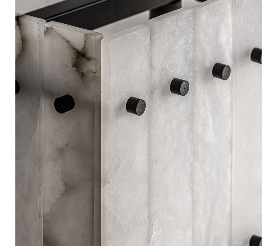 Hornú časť lustra tvorí čierny obdĺžnikový kovový kryt, z ktorého visia dve robustné kovové retiazky. Tie dodávajú závesu stabilitu a zároveň slúžia ako výrazný dizajnový prvok, ktorý kontrastuje s jemnosťou svetlého mramoru. Vnútorné osvetlenie prechádza cez polopriesvitné kamenné plochy a vytvára mäkké a teplé rozptýlené svetlo.