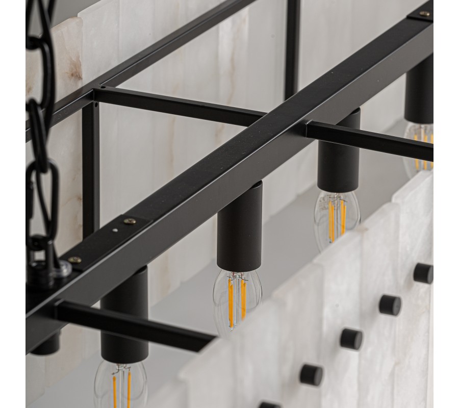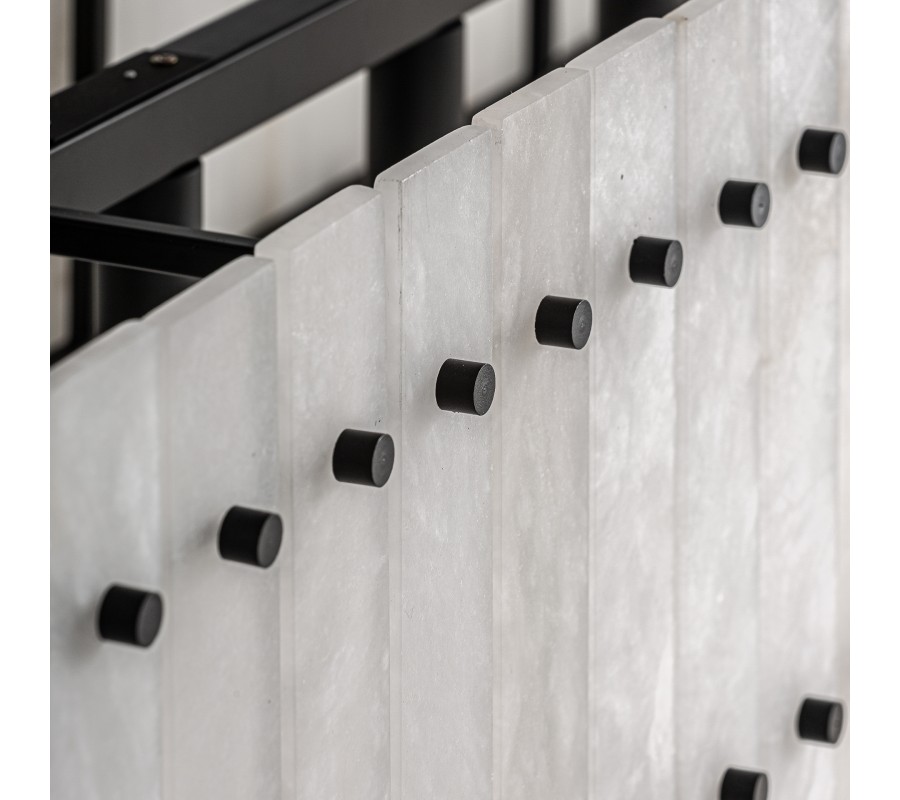 Závesný luster Sara je výnimočný industriálny kúsok, ktorý spája robustnú kovovú konštrukciu s elegantným kamenným tienidlom a vytvára tak luxusný svetelný objekt do štýlových interiérov. Obdĺžnikové tienidlo pozostáva z množstva bielych mramorových doštičiek s jemnou prírodnou kresbou, ktoré sú zvislo uchytené na vnútornej kovovej konštrukcii. Táto konštrukcia je z vonkajšej strany viditeľná v podobe pravidelných dvojradových kovových úchytov – malých čiernych valčekov, ktoré vytvárajú grafický rytmus a zároveň dotvárajú industriálny charakter lustra.