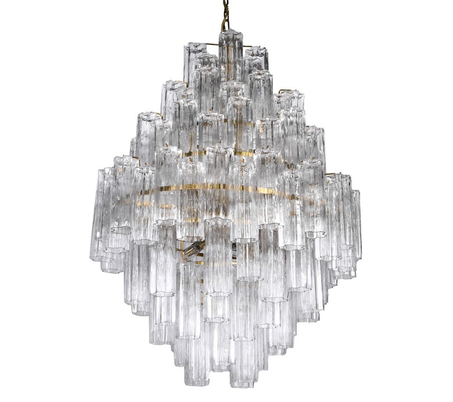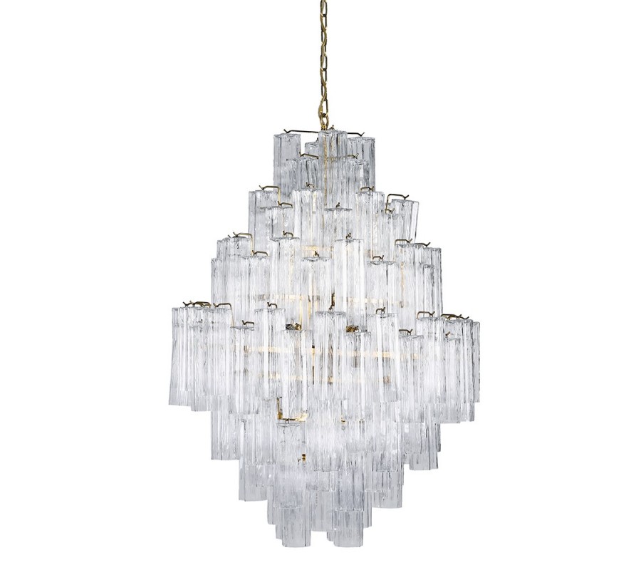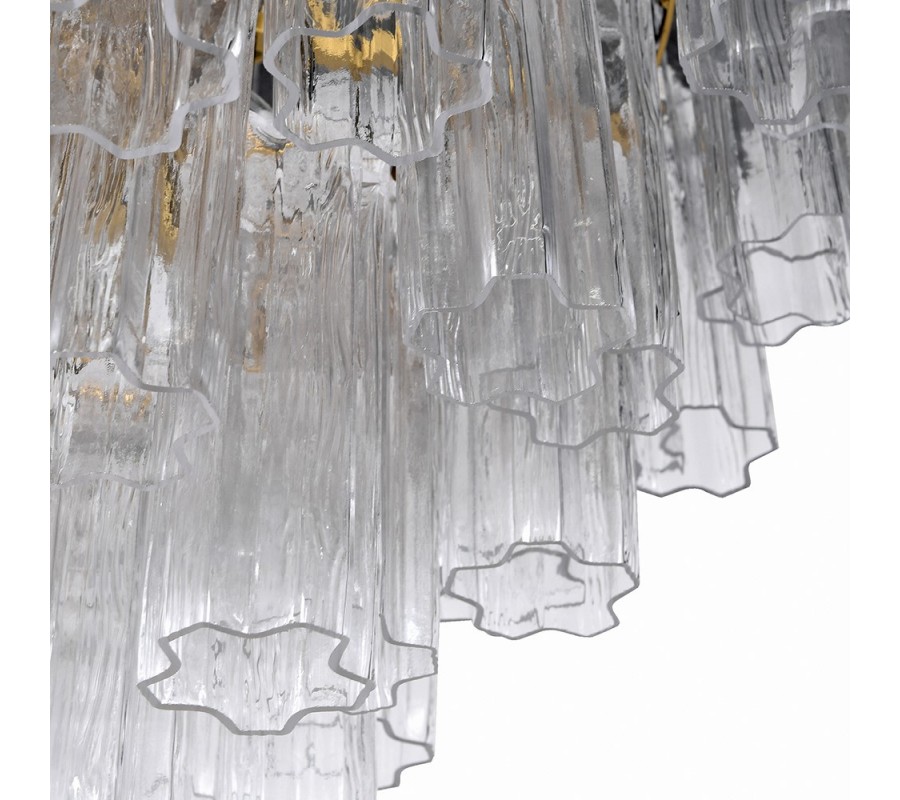 Luster má vnútornú konštrukciu z kovu v lesklom zlatom prevedení. Sú na nej kaskádovito upevnené sklenené trubičky s vertikálnym tvarovaním. Ich ohýbaný povrch vytvorí zaujímavé odlesky svetla, vďaka čomu bude svietidlo po zažatí pôsobiť bohatým krištáľovým dojmom. Tienidlo má elegantnú siluetu, s rozšírenou strednou časťou, prechádzajúcou do užšieho vrchu a spodku.
