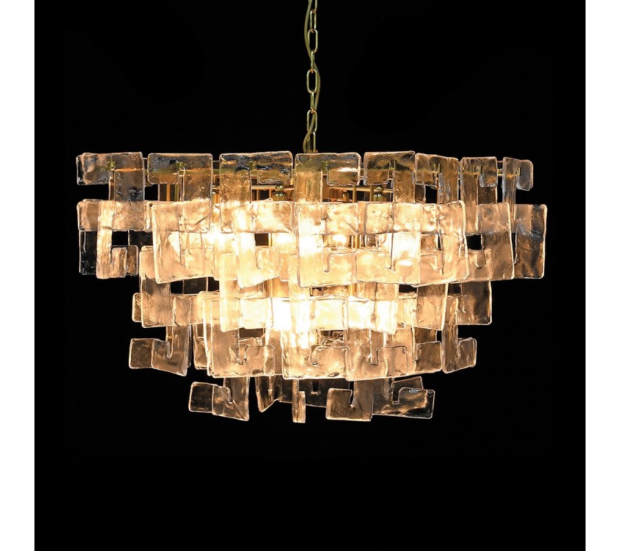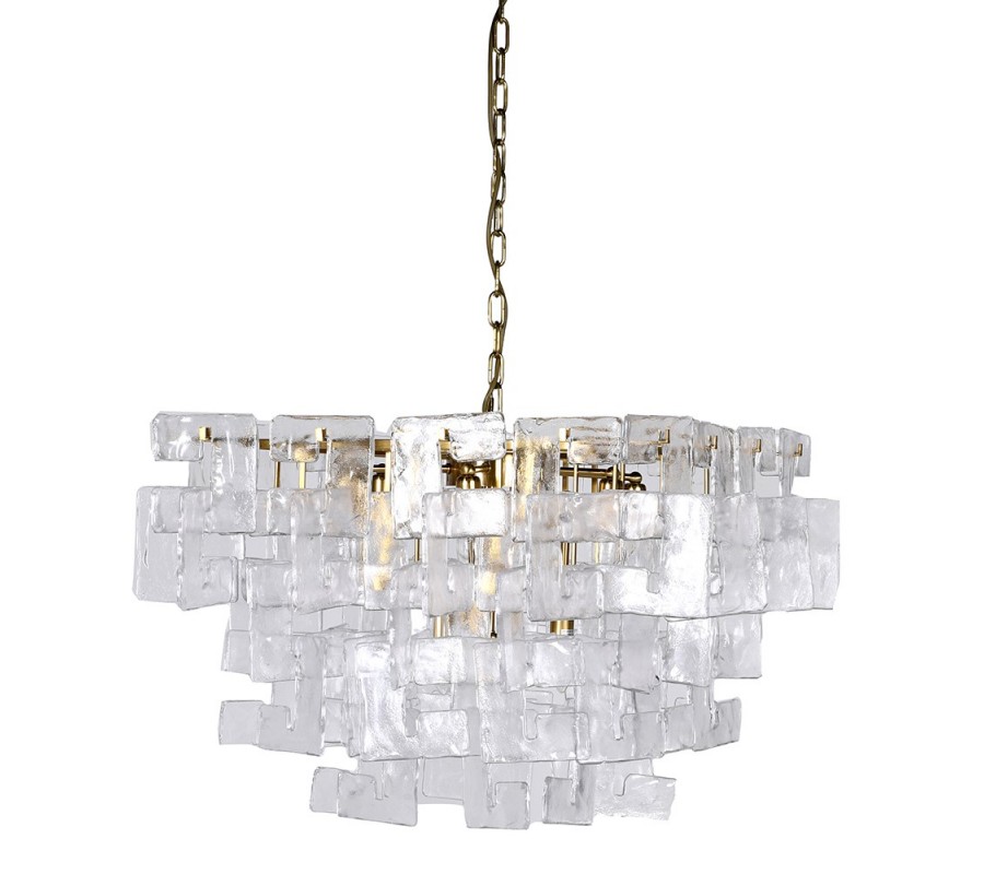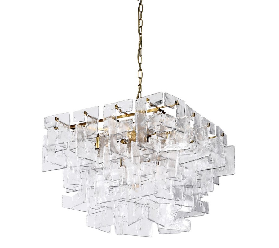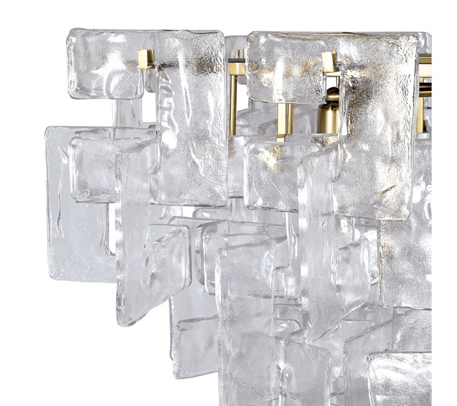 Luxusný glamour luster Crystalis predstavuje jedinečný kúsok, ktorý dodá interiéru noblesu a reprezentatívny charakter. Je navrhnutý v štvorcovom tvare a jeho konštrukciu tvorí kovová zlatá základňa, ktorá pôsobí elegantne a zároveň moderne. Najväčšiu pozornosť púta dvojposchodové tienidlo, vytvorené zo štruktúrovaných sklenených doštičiek, ktoré sú uložené vo vrstvách a navzájom sa prelínajú. Tento spôsob skladania skla vytvára luxusný kaskádový efekt, pri ktorom svetlo preniká a láme sa cez nepravidelnú štruktúru skla, čím vzniká dojem lesknúcich sa ľadových kryštálov.