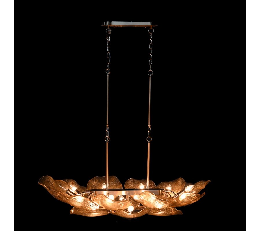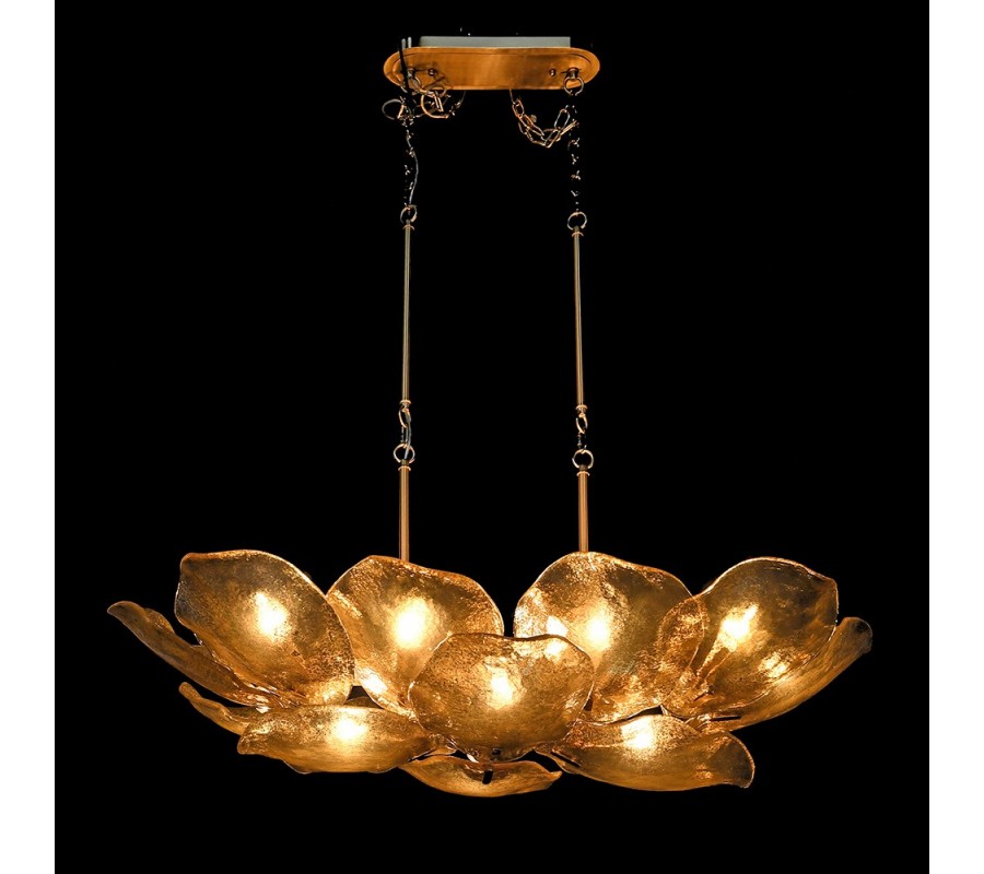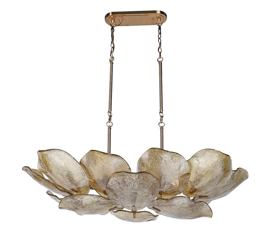 Dizajnový glamour luster Shape s organicky tvarovanými sklenenými tienidlami v zlatom odtieni a s kovovou konštrukciou 200 cm