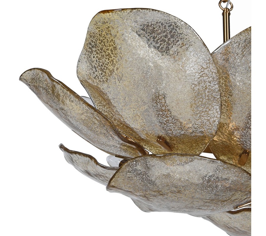 Dizajnový glamour luster Shape predstavuje výrazný svetelný prvok, ktorý v interiéri pôsobí ako umelecký objekt s prírodnou inšpiráciou. Jeho dominantou je bohato vrstvené tienidlo tvorené organicky tvarovanými sklenenými plátmi pripomínajúcimi lupene kvetu alebo listy, ktoré sú usporiadané do nepravidelného tvaru.