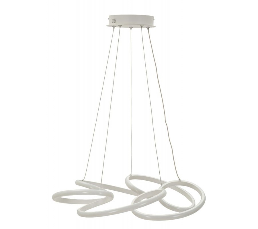 Luster je vyrobený z kombinácie kovu a plastu, čo mu zaručuje pevnosť a zároveň odľahčenú váhu. Základom je konštrukcia štíhleho kruhového tvaru s priemerom 55 cm, ohýbaná do výrazných kriviek a slučiek. Tvar je dynamický, bohatý a zároveň pravidelný, čo jej v kombinácii s čistým bielym prevedením dodáva moderný výraz. Konštrukciu dopĺňajú po obvode LED pásy, ktoré poskytnú bohaté osvetlenie s tromi stupňami teploty - studeným bielym, neutrálnym a teplým žltým. Štyri závesné lanká a prívodný kábel zaručujú stabilitu a vo vrchnej časti ich dopĺňa okrúhly stropný kryt.