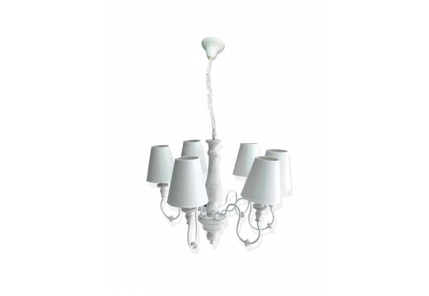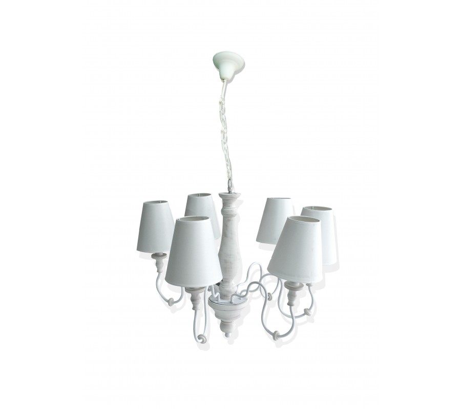 Štýlový luster so šiestimi ramenami, na ktorých sa nachádzajú tienidlá je u nás k dispozícii v bielom farebnom prevedení. Mimoriadne elegantný tvar z neho robí doplnok ideálny predovšetkým do útulných, svetlých interiérov zariadených v provensálskom, vidieckom ale aj rustikálnom štýle.