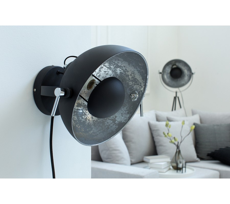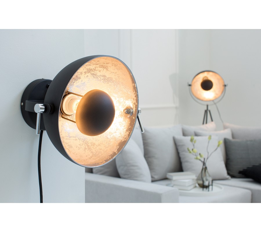 Dizajnové nástenné svietidlo Studio v čierno-striebornom prevedení je vyrobené z hliníka a nehrdzavejúcej ocele. Svetlo je v štýlovom industriálnom štýle a vzhľadom pripomína štúdiové svetlá. Zvnútra je lampa striebornej farby vďaka čomu po zasvietení vnútro pekne žiari. Lampa má mierne ošúchaný vzhľad, čo pridáva na industriálnom vzhľade.