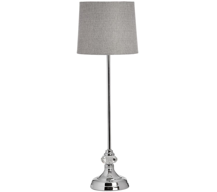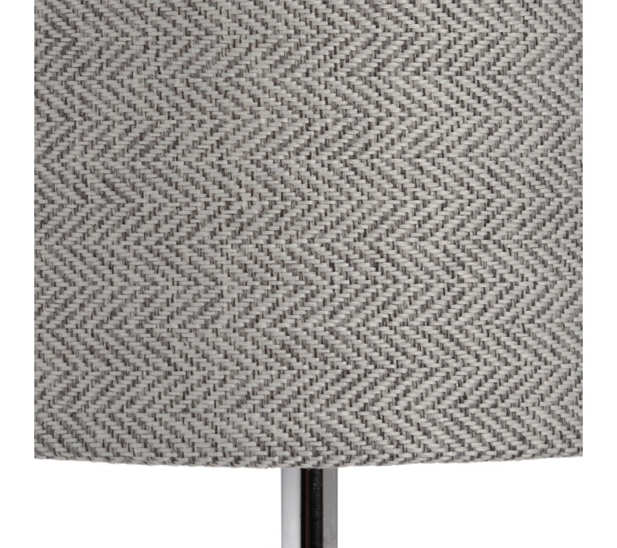 Štýlová lampa Genoa je unikátny kúsok do vašej obývačky či spálne. Dominantou lampy je kovová chrómovaná podstava v striebornej farbe, ktorá sa skladá z jednoduchých rovných ale aj tvarovaných línií. Dlhá úzka tyč pokračuje do dolnej časti, kde sa nachádza mohutné zakončenie podstavy so širšími a užšími kruhovými detailmi pričom v ich strede sa nachádza krištáľ, ktorý obopína obvod podstavy. Tienidlo má jednoduchý minimalistický vizuál so sivými a čiernymi prešívaniami, ktoré vytvárajú vzory.