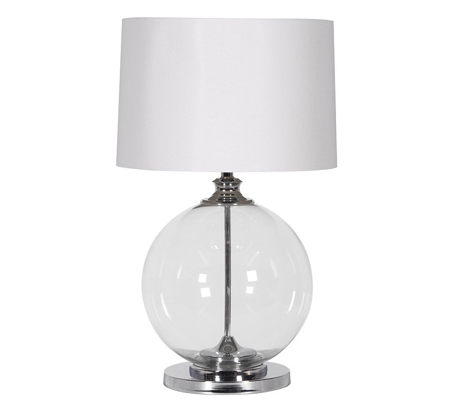 Elegantná stolná lampa kombinuje moderný dizajn s nádychom klasickej estetiky a kvalitných materiálov, ako sú kov, ľan a sklo. Podstava má tvar priesvitnej sklenenej gule, ktorá pôsobí ľahko a vzdušne, pričom dodáva lampe sofistikovaný vzhľad. Tienidlo je klasického valcového tvaru, vyrobené z jemného ľanu v neutrálnej bielej farbe, čo zaisťuje jemné rozptylovanie svetla a vytvára príjemnú atmosféru.