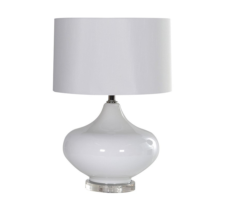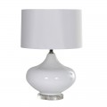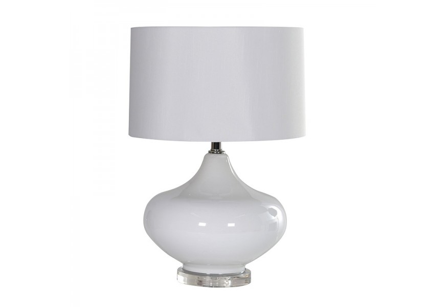Stolová lampa predstavuje harmonickú kombináciu moderného dizajnu a jemnej elegancie. Podstava má zaoblený, sploštený tvar pripomínajúci vázu. Je vyrobená zo skla s lesklým povrchom v bielej farbe, ktorý pôsobí čisto a nadčasovo. Tienidlo je klasického valcového tvaru, vyrobené z ľanu v neutrálnej bielej farbe, ktorá jemne rozptyľuje svetlo a vytvára príjemnú atmosféru.