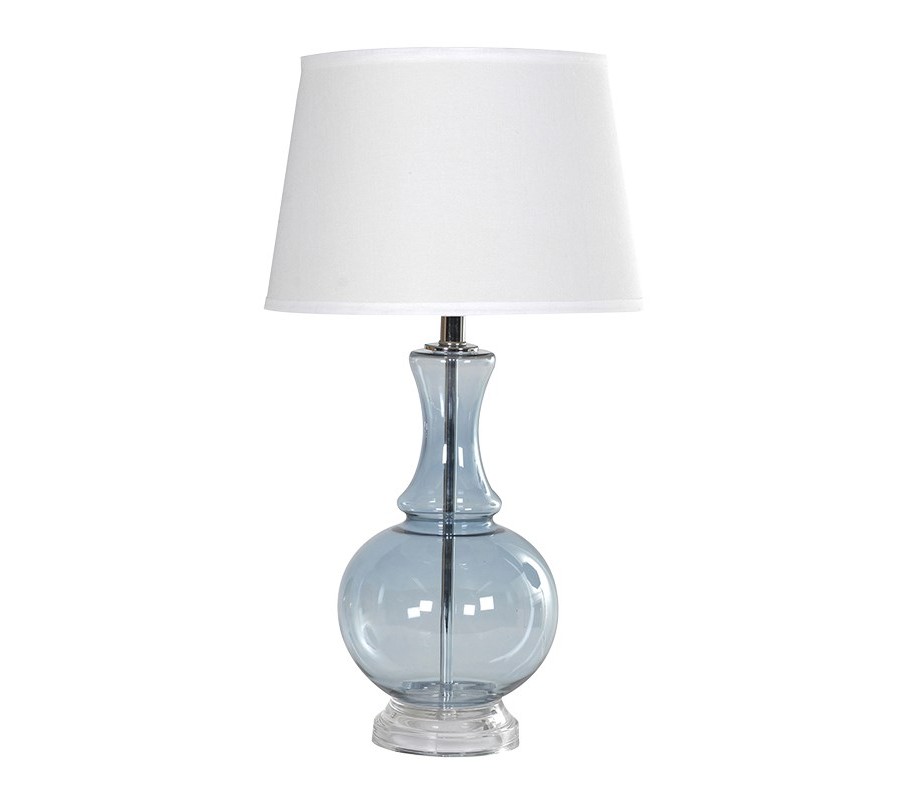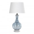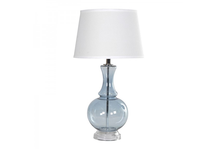 Stolová lampa pôsobí jemne a elegantne, pričom vyniká kombináciou tradičných tvarov a moderných materiálov. Noha lampy je vyrobená zo skla a má tvar pripomínajúci klasickú vázu s oblým spodným dielom a zužujúcim sa krkom, čo jej dodáva rafinovaný vzhľad. Sklenený povrch je hladký, lesklý a má jemný modro sivý odtieň, ktorý navodzuje pocit vzdušnosti a sviežosti. Tienidlo je klasického valcového tvaru, vyrobené z bielej ľanovej látky, ktorá jemne rozptyľuje svetlo a dodáva miestnosti útulnú atmosféru. Kovové detaily, ako sú podstava a tyč vo vnútri lampy , dopĺňajú dizajn a pridávajú moderný akcent.