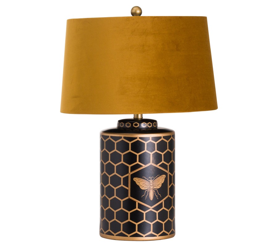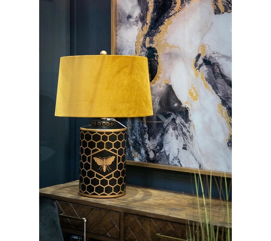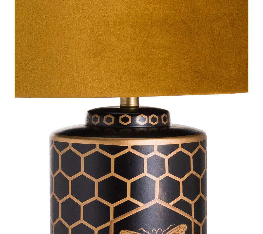 Luxusná stolná lampa Abejo je nádherným predstaviteľom art-deco štýlu. Dômyselná kombinácia čiernej a horčicovej farby zamatového tienidla zabezpečuje lampe naozajstný šmrnc, ktorý podtrháva kresba zlatej farby, zobrazujúca pozadie v tvaroch pripomínajúcich včelí plást a siluetu včely samotnej. Lampa Abejo dokonale zapadne najmä do obývačiek, predsiení, spální, či reprezentačných priestorov firiem so zemitými farbami a a s dekoráciami z luxusných materiálov akými sú napríklad povrchy pripomínajúce drahé kovy.