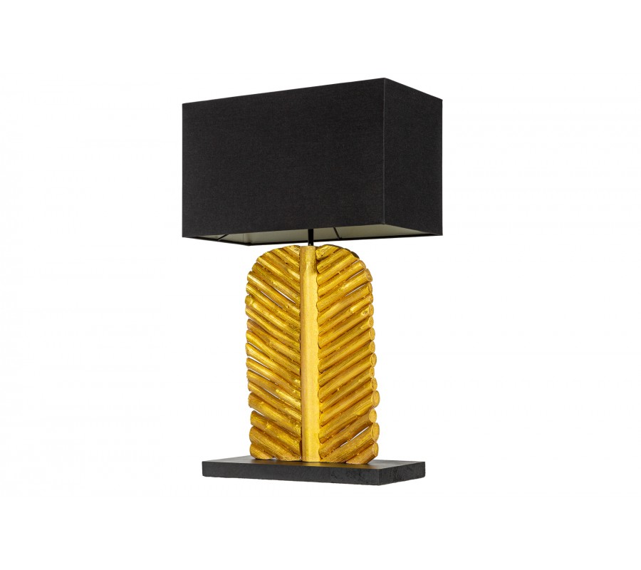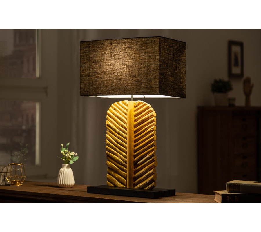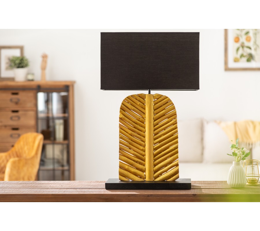 Jedinečná stolná lampa Misivo sa stane dokonalým doplnením vášho interiéru. Zlatý odtieň podstavy sa kontrastne dopĺňa s čiernym tienidlom v nadčasovom obdĺžnikovom tvare. Podstava vyrobená z kúskov dreva je inšpirovaná organickým tvarom listu a prináša do interiéru čaro prvkov prevzatých z prírody. Môžete ju použiť ako doplnenie obývacej izby, haly a knižnice vo svojej domácnosti alebo ju umiestniť na nočnom stolíku, kde vás bude sprevádzať počas čítania obľúbenej knihy. Okrem moderne ladených interiérov sa stane dokonalým doplnením priestorov s Art-deco prvkami či masívnym a kovovým nábytkom. K výrobku odporúčame žiarovku E27 s maximálnym výkonom 60W, ktorá nie je súčasťou balenia.