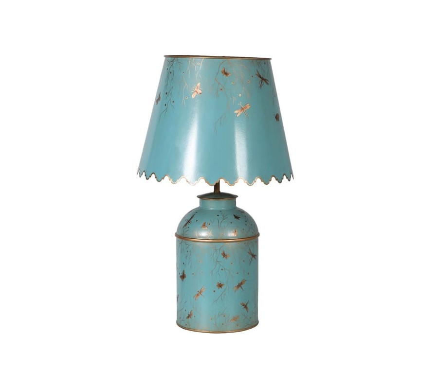 Dizajnová nočná lampa Severine Azur zaujme svojím unikátnym dizajnom, ktorý do vašich priestoroch vnesie jedinečný nádych vintage štýlu. Konštrukcia lampy vyrobená z kovu sa nesie v jemnej azúrovej farbe. Povrchovú úpravu tvoria jemné zlaté ornamenty zobrazujúce lesné motívy a hmyz. Toto precízne ručné zdobenie dodáva lampe jedinečný nádych vintage štýlu a zaujme na prvý pohľad. Okrem príjemnej farebnej kombinácie a unikátneho zdobenia môže zaujať aj tvarom tienidla s ozdobným lemom. Nočná lampa Severine vhode doplní priestory každej vintage ladenej spálne, no svoje miesto si môže nájsť aj v obývačke, pracovni či v beauty salónikoch alebo priestoroch štýlových vintage kaviarní alebo čajovní. Skvelo vynikne v kombinácii s masívnoym nábytkom a pohodlnými čalúnenými kreslami či posteľou.
