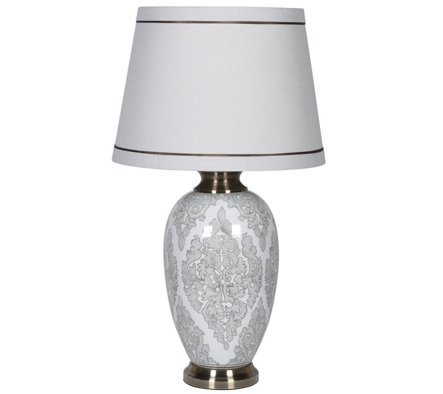 Vintage porcelánová sivo-biela stolná lampa Selena s jemnou ornamentálnou kresbou a metalickou podstavou 77cm