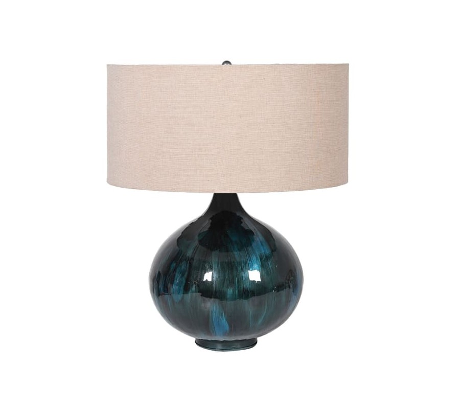 Štýlová nočná lampa Laguna predstavuje unikátny doplnok vhodný do vintage či art deco ladených interiérov. Jej dominantým prvkom je elegantná keramická podstava oblých tvarov v čiernej farbe s tónmi azúrovej a modrej, pričom výsledná povrchová úprava pripomína akvarelovú maľbu. Jednoduché textilné tienidlo v svetlej béžovej farbe príjemne kontrastuje s dominantnou podstavou a vďaka príjemnému tlmeniu svetla dodá vášmu interiéru útulný nádych. Nočná lampa Laguna krásne vynikne na tmavých masívnych nočných stolíkov, rovnako ako aj na nábytku zo skla v kombinácii s luxusnou čalúnenou posteľou. Vhodné sú žiarovky typu B22 max 40W.