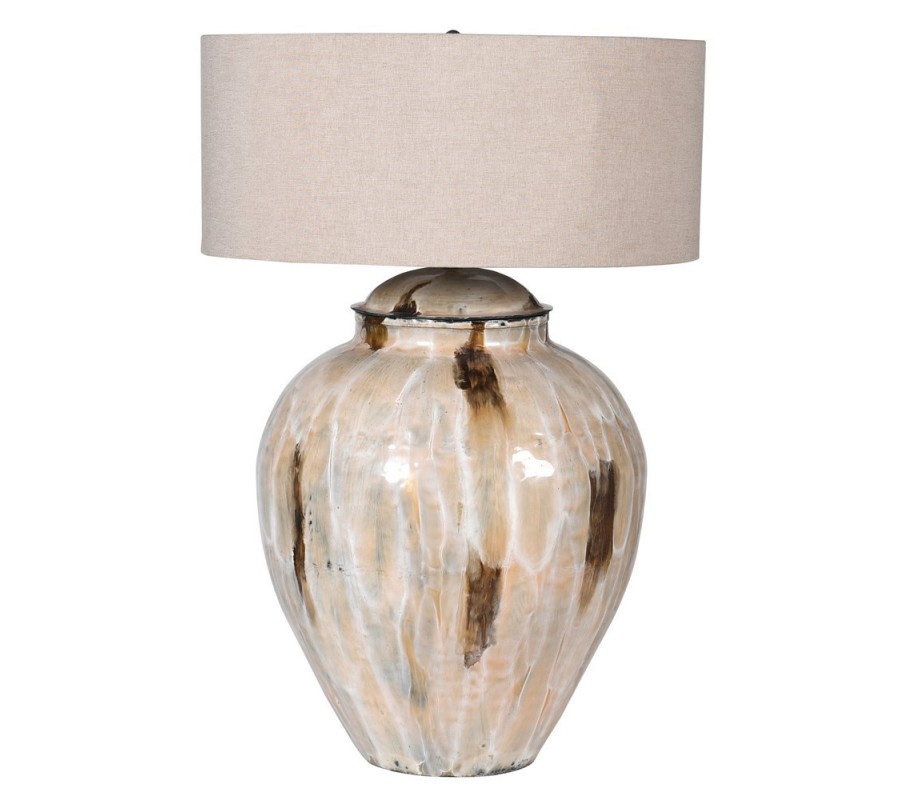 Výnimočná stolná lampa Creamy s keramickou podstavou v jemnej krémovej a kávovej hnedej farbe s abstraktnou kresbou. Prevedenie vo vintage štýle so svetlým kapučínovým hnedým tienidlom okrúhleho tvaru sa skvelo hodí do vintage luxusne ladených pracovní a knižníc zariadených v zemitých prírodných farbách. Vďaka mohutnej podstave v tvare bankovitej vázy vynikne na masívnych vyzerávaných písacích stoloch a komodách v tmavej kávovej farbe s mohutnými kovovými úchytmi. Ak hľadáte kúsok, ktorý bude nadčasovým základným kameňom vášho útulného domova. Rovnako vytvorí harmóniu s koloniálne pôsobiacimi vankúšmi so strapcami a farebnými výšivkami.