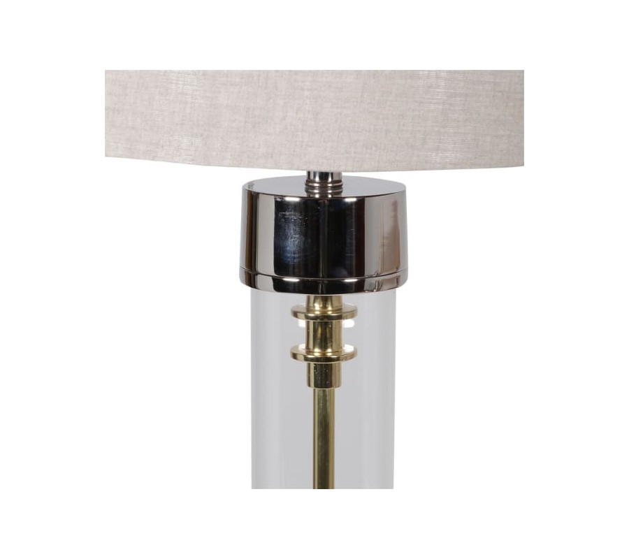 Elegancia nočnej lampy Glenn si získa nejedného milovníka nadčasových moderných doplnkov či štýlu art-deco. Toto jedinečné svietidlo využíva kvalitné materiály s dôrazom na luxusný a elegantný vzhľad a jednoduchú, príjemnú farebnosť. Sklenená priesvietná konštrukcia necháva vyniknúť zlatý dizajnový prvok vnútornej konštrukcie, ktorý prepája striebornú kovovú podstavu s vrchnou časťou a tienidlom. Kombinácia týchto farieb spolu s priesvitnou konštrukciou vytvára neztameniteľný nádych art-deco štýlu. Celkový vzhľad lampy dopĺňa jej jednoduché okrúhle textilné tienidlo béžovej farby. Lampa Glenn môže doplniť váš nočný stolík v art-deco ladenej spálni, príručný stolík luxusných obývačiek či elegantnú konzolu v predsieni alebo chodbičke. Do lampy sú vhodné žiarovky typu B22 max 40W.
