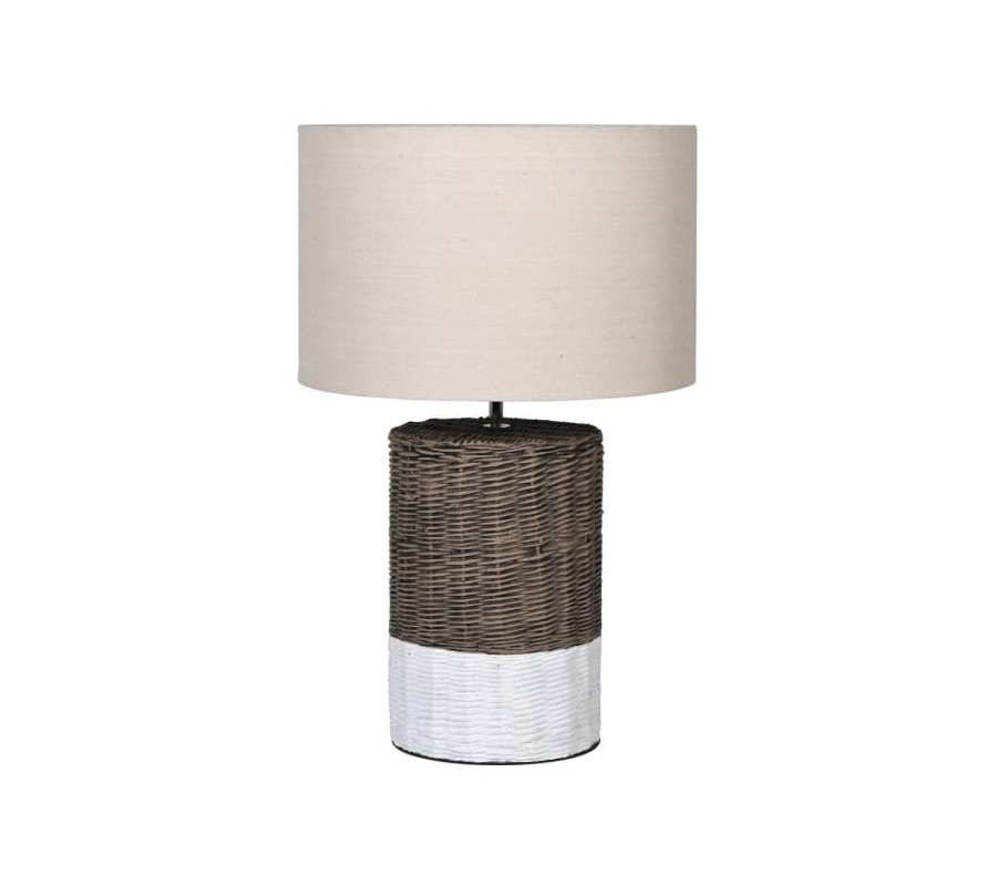 Vidiecka prútená nočná lampa Munford v hnedo bielom prevedení s krémovým ľanovým tienidlom 66cm