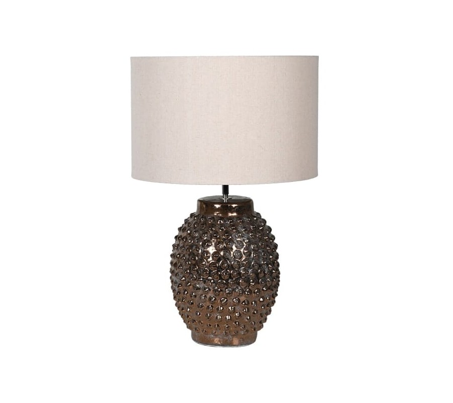 Štýlová stolná lampa Anya predstavuje luxusný a unikátny doplnkom vhodný do moderných i klasickejšie ladených priestorov. Lampa Anya okrem príjemne tlmeného osvetlenia zaujme svojím elegantným vzhľadom, ktorý efektne doplní nočný či príručný stolík, drevenú komodu či sklenenú konzolu. Zaujme svojou okrúhlou keramickou podstavou v štýlovej bronzovej farbe, ktorú zdobí jemný bublinkový reliéf s patinou. Dopĺňa ju jednoduché okrúhle tienidlo z ľanu v prírodnom krémovo-bielom prevedení. Stolnú lampu Anya si zamiluje nejeden nadšenec luxusných interiérových doplnkov a tento unikátny kúsok môže zdobiť príbytok aj vám! Do lampy sú vhodné žiarovky typu E27 max 60W.