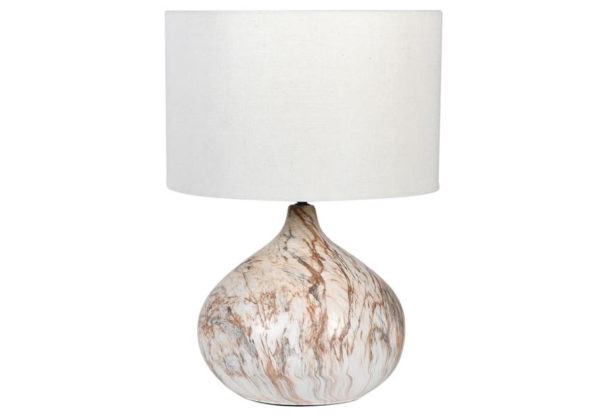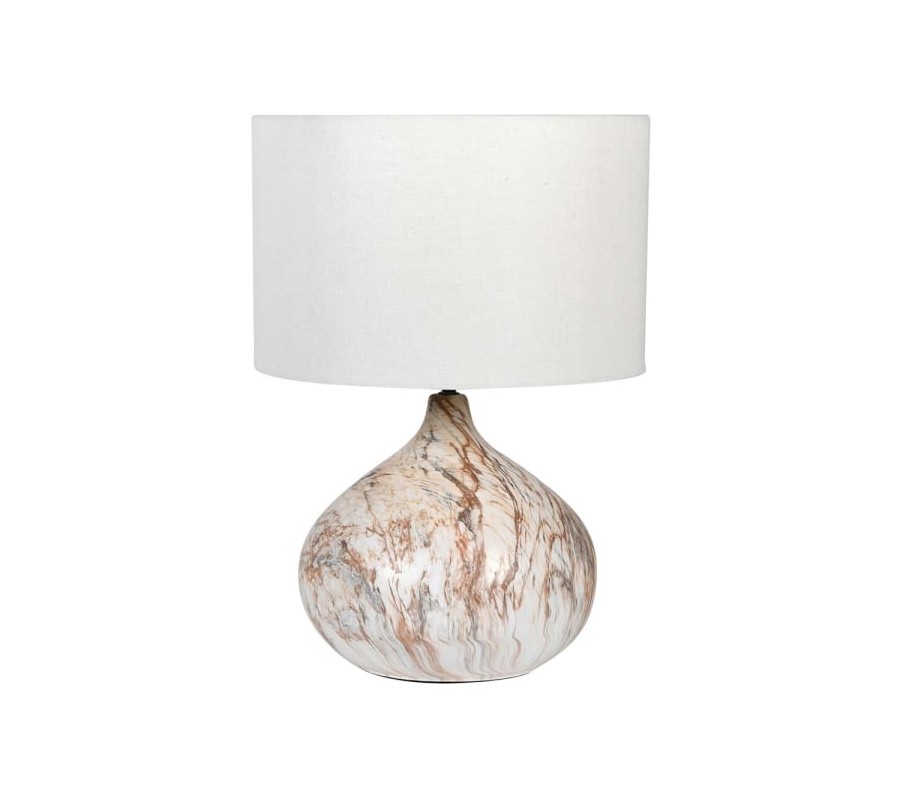 Luxusná nočná lampa Monterey je špecifická vďaka svojmu nadčasovému inovatívnemu dizajnu. Disponuje elegantnou okrúhlou podstavou bielej farby, ktorú zdobí jemný abstraktný vzor v hnedých odtieňoch pripomínajúci mramorovú štruktúru. Keramickú podstavu dopĺňa jednoduché okrúhle tienidlo, ktoré svojím bielym prevedením dodáva lampe eleganciu a moderný nádych. Lampa Monterey je výborne kombinovateľným kúskom a zapadne do moderne, ale i klasickejšie ladených priestorov. Svoje miesto si nájde napríklad na drevenom nočnom či príručnom stolíku, sklenenej konzole či komode z kovu.