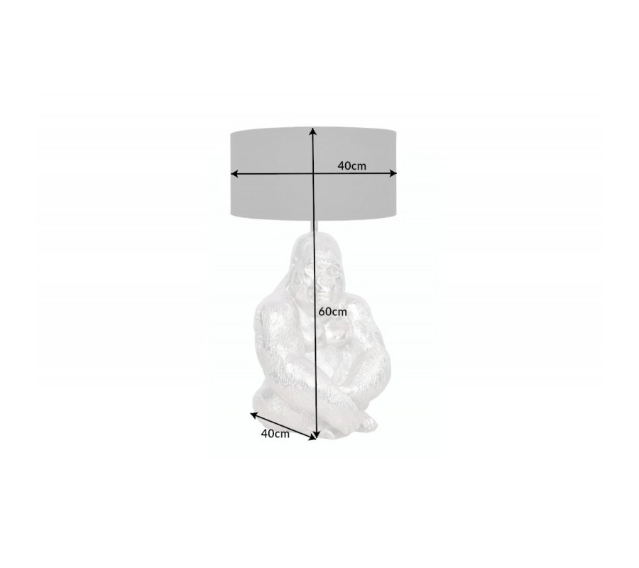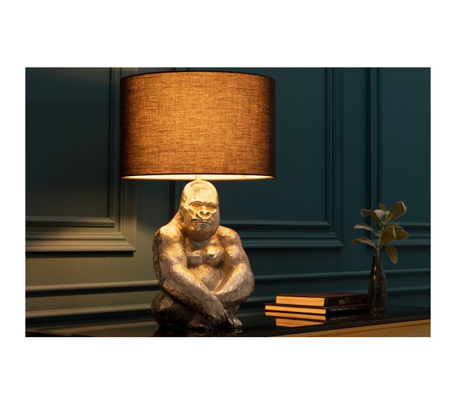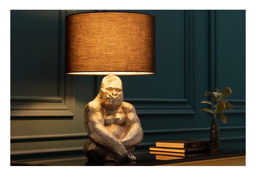 Hľadáte do svojich priestorov jedinečný doplnok, ktorý zaujme už na prvý pohľad? Upútať vás môže stolná lampa Apell, a to predovšetkým svojím nevšedným dizajnom a podstavou v tvare gorily. Toto originálne svietidlo je vyrobené z kovu a nesie sa v striebornej farbe. Podobizeň gorily sa píši detailným prepracovaním a váš interiér obohatí o unikátny dizajnový efekt. Výraznú podstavu dopĺňa jednoduché čierne textilné tienidlo okrúhleho tvaru. Lampička Apell si svoje miesto nájde v moderne i art deco ladených interiéroch, kde krásne doplní príručný alebo nočný stolík. Vhodné sú žiarovky typu E27 max 40W.