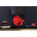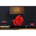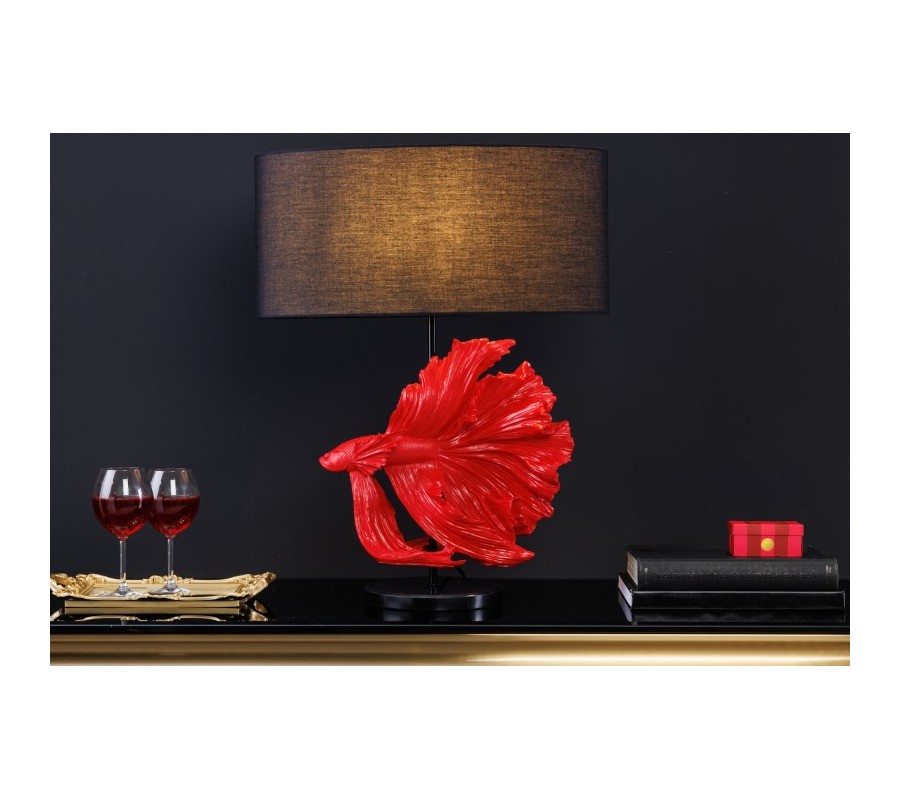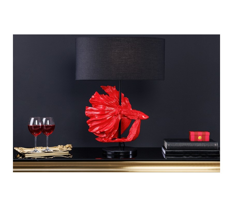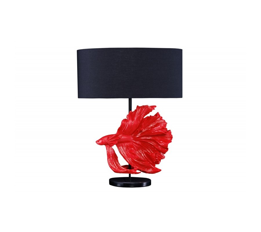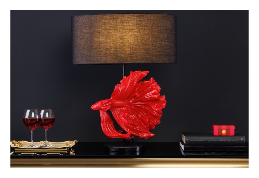 Dizajnová stolná lampa Sidoria s červenou podstavou v tvare ryby s čiernym okrúhlym tienidlom 64cm