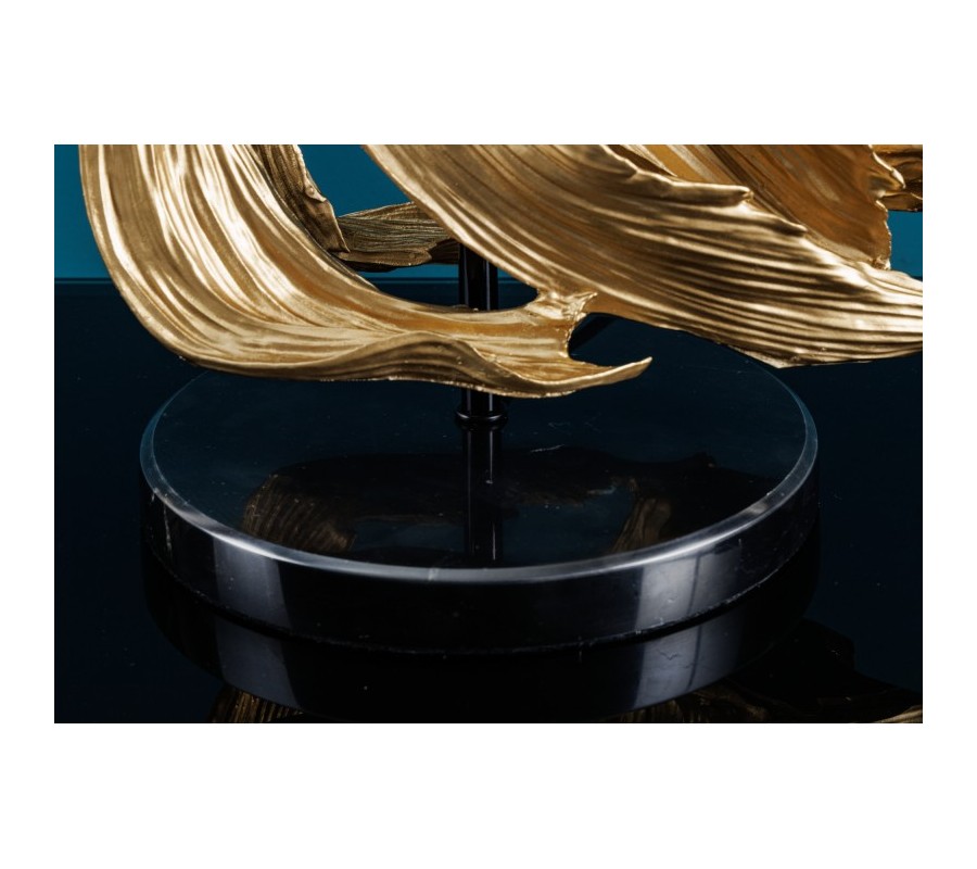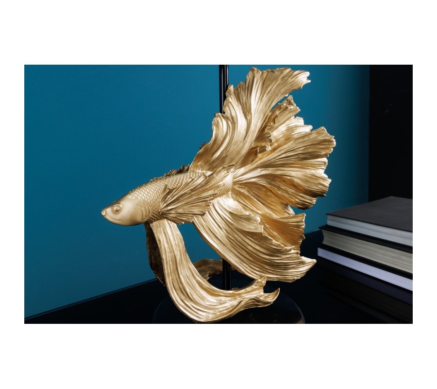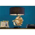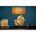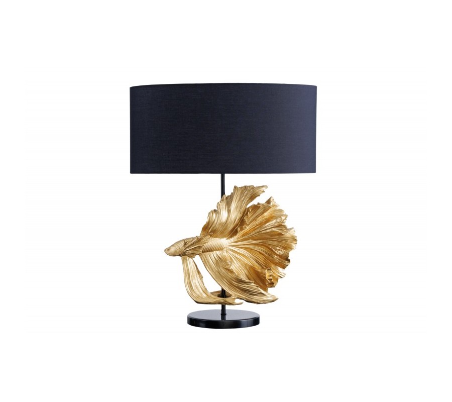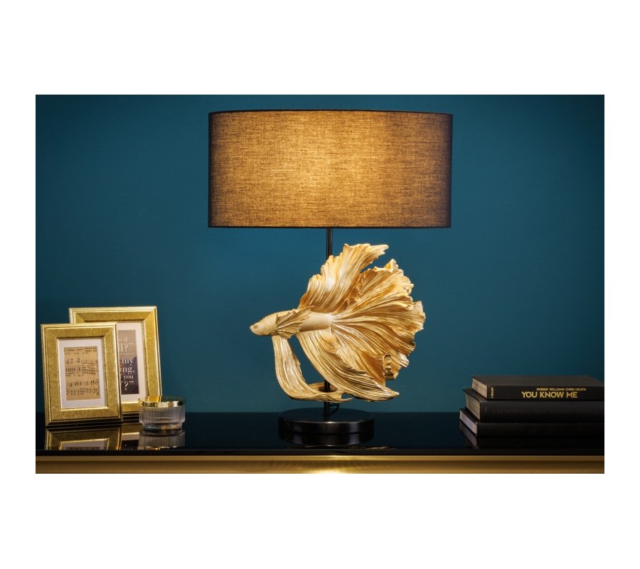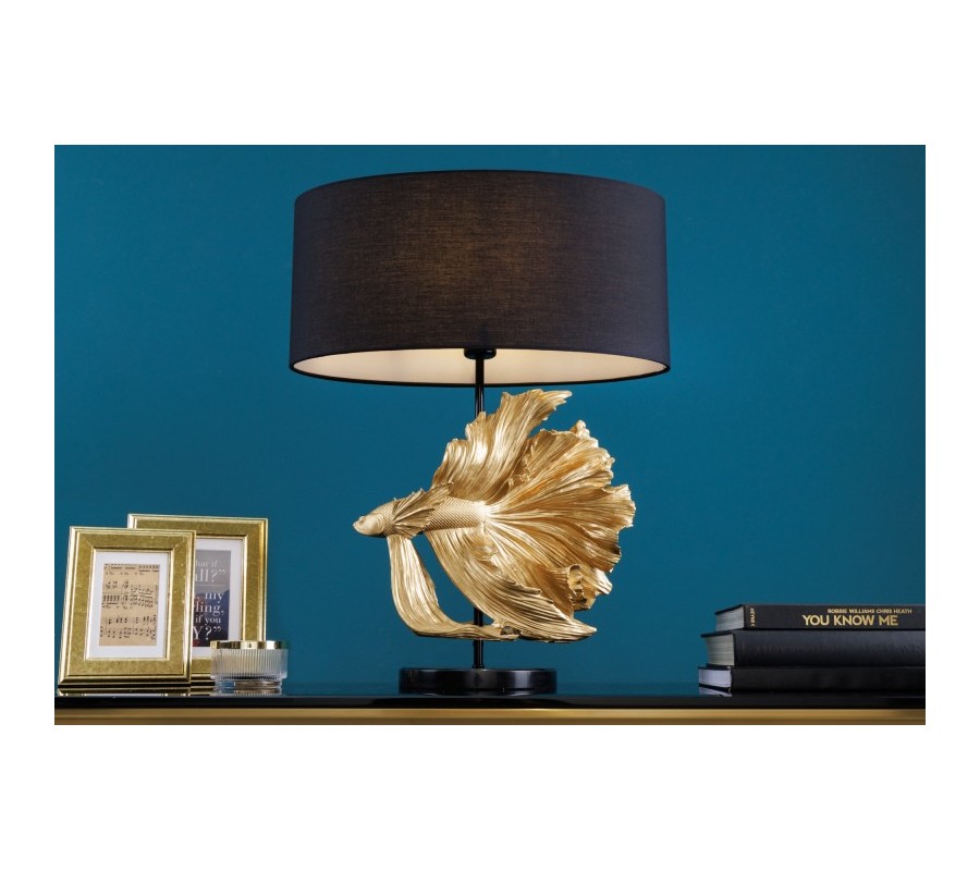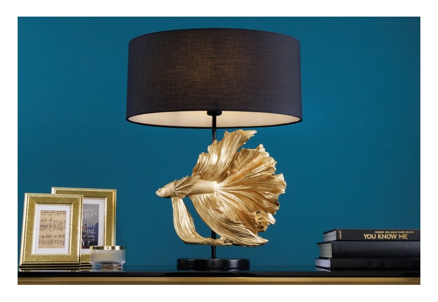 Dizajnová art deco stolná lampa Sidoria so zlatou podstavou v tvare ryby a čiernym tienidlom 65cm
