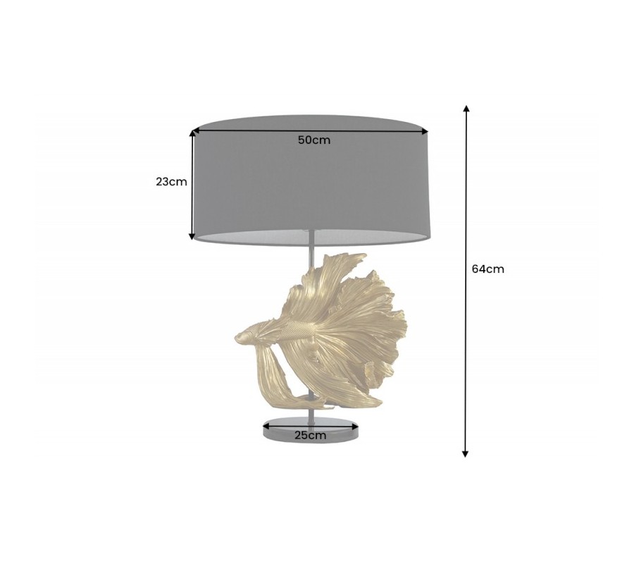 Štýlová stolná lampa Sidoria zaujme už na prvý pohľad vďaka svojej dizajnovej podstave v tvare ryby. Ručne vyrábaná a zdobená podstava disponuje krásnymi detailnými vzormi a nesie sa v žiarivej zlatej farbe. Do vašich priestorov tak vnesie jemný nádych štýlu art deco. Dizajnovú podstavu dopĺňa jednoduché okrúhle tienidlo čiernej farby, ktoré príjemne stlmí svetlo a vytvorí tak útulnú atmosféru. Lampa Sidoria skvelo vynikne na nočnom stolíku v spálni, rovnako ako aj na príručnom alebo telefónnom stolíku či štýlovej komode v obývačke alebo hosťovskej izbe. Jej glamour vzhľad krásne doladí nábytok zo skla či tmavého masívneho dreva. Na umocnenie štýlu art deco sú tiež vhodné zrkadlového či mramorové povrchy a štýlové textílie zo zamatu. Do lampy je vhodná žiarovka typu E27 max 60W.