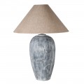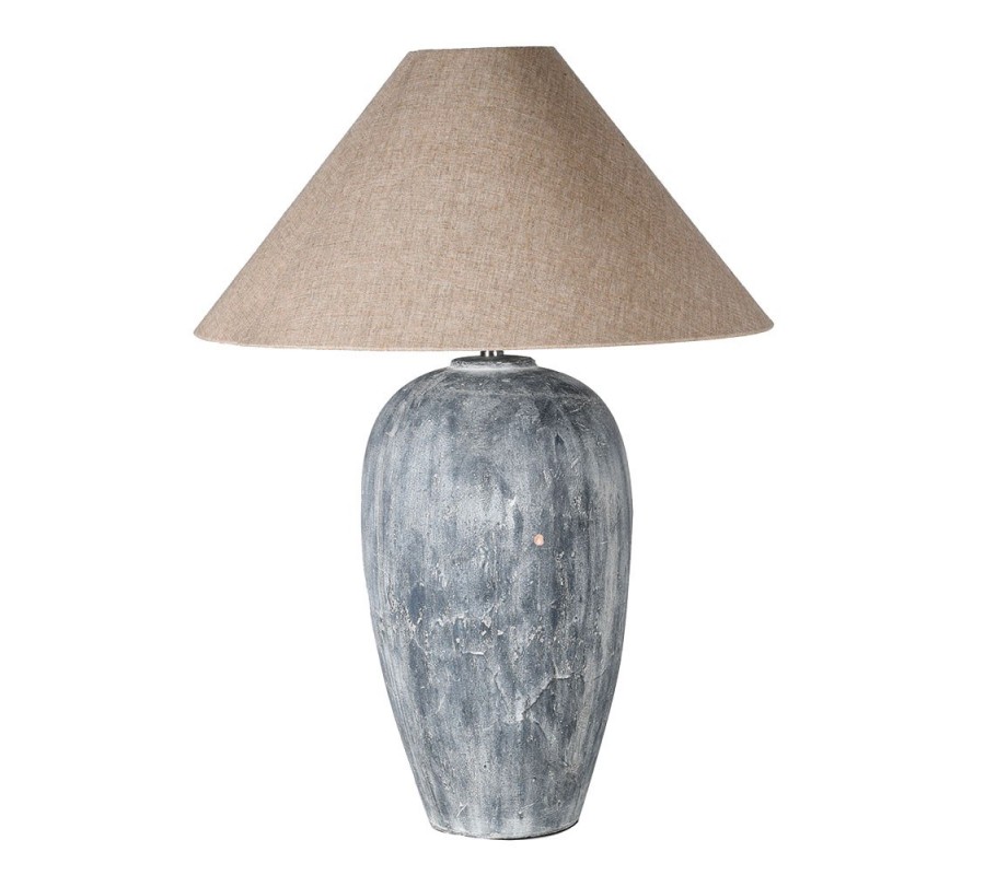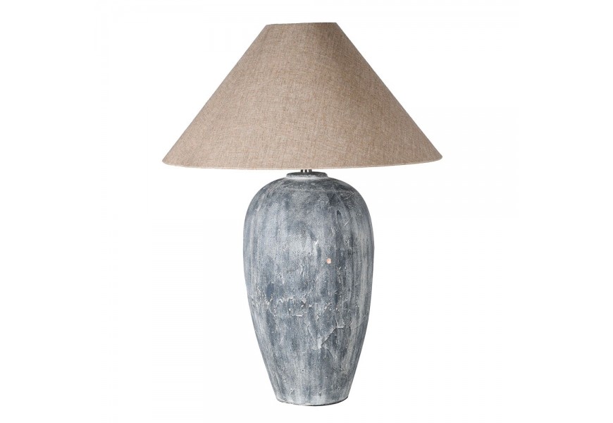 Vo vrchnej časti sa nachádza tienidlo vyrobené z ľanovej textílie. Materiál má výraznejšie tkanie a prírodne pôsobiaci béžový odtieň. Podstava je poniklovaná, v príjemnom sivomodrom odtieni. Povrch je upravený takzvaným washed efektom, ktorý pripomína vymytý biely náter a dodáva lampe charakter starožitného nábytku.