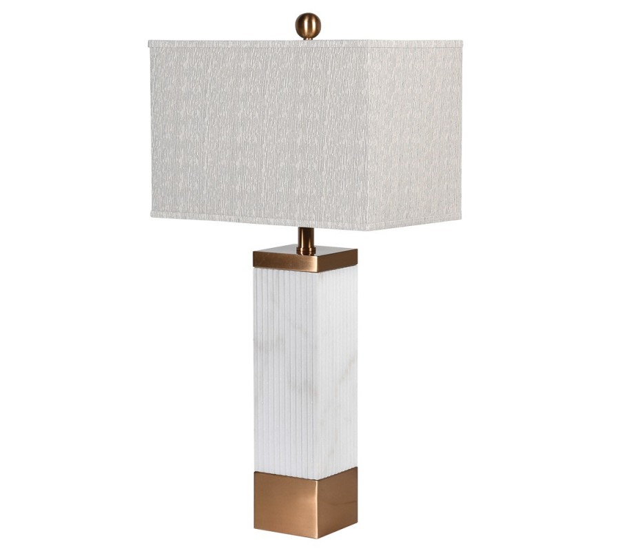 Stolová lampa Elysion vnesie do vášho domova luxus éry art deco. Dominujú jej rovné línie, s ktorými ladí aj vertikálny drážkovaný reliéf na mramorovej časti podstavca. Prírodnú kresbu kameňa dopĺňa jemne štruktúrované tienidlo v oblačnej šedej farbe. Stĺpová podstava je na oboch stranách ukončená bronzovým detailom, ktorý na vrchnej časti prechádza do konštrukcie pridržiavajúcej tienidlo, Kombinácia lesklej bronzovej farby s exkluzívnym bielym mramorom dodáva lampe naozaj honosný a elegantný výzor. Ľahko ju tak zakomponujete do priestorov zariadených v glamour štýle, alebo ju môžete doplniť nábytkom v podobnými lesklými prvkami - napríklad stoličkami či sedačkou s bronzovými alebo zlatými nožičkami a zamatovým čalúnením v svetlých odtieňoch. Jej krása vynikne v kombinácii s jednoduchým lineárnym moderným nábytkom. V takejto kompozícii bude okrem funkčného svietidla aj výnimočnou a originálnou dekoráciou. Do lampy potrebujete žiarovku s objímkou E27 a maximálnym príkonom 60 wattov. Dĺžka napájacieho kábla je 150 cm.