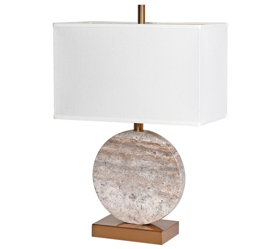 Luxusná art-deco stolová lampa Cersei upúta svojím originálnym dizajnom založeným na kontraste geometrických tvarov. Dominantným prvkom je podstava s vertikálne postaveným mramorovým kruhom, cez ktorú prechádza okrúhla centrálna os kovovej konštrukcie v bronzovej farbe. Oblé tvary sú doplnené hranatým podstavcom a hranatým ľanovým tienidlom. Jeho neutrálne biela farba pôsobí elegantne a zároveň necháva vyniknúť luxusný mramorový prvok. Prirodzená kresba tohto exkluzívneho kameňa a jeho teplé farebné tóny hnedej a béžovej sa prepájajú s bronzovou farbou konštrukcie a lampa tak pôsobí honosným, no vkusným dojmom. Hodí sa do priestorov zariadených v art deco štýle, kde ju môžete doplniť nábytkom s podobnými bronzovými prvkami a zamatovým čalúnením v svetlých farbách. Pokiaľ chcete oživiť prázdny priestor, lampu môžete položiť na moderný stolík v neutrálnych svetlých farbách alebo so zrkadlovým povrchom a s rovnými líniami, ktoré sa prepoja s geometrickými tvarmi podstavca a tienidla. V tejto kompozícii krásne vynikne mramorový prvok a lampa bude okrem funkčného svietidla aj originálnou dekoráciou. Vďaka bronzovým prvkom sa tiež hodí do obývačky či jedálne v glamour štýle, alebo do spálne na nočný stolík. Do lampy potrebujete žiarovku s objímkou E27 a maximálnym príkonom 60 wattov. Dĺžka napájacieho kábla je 150 cm.
