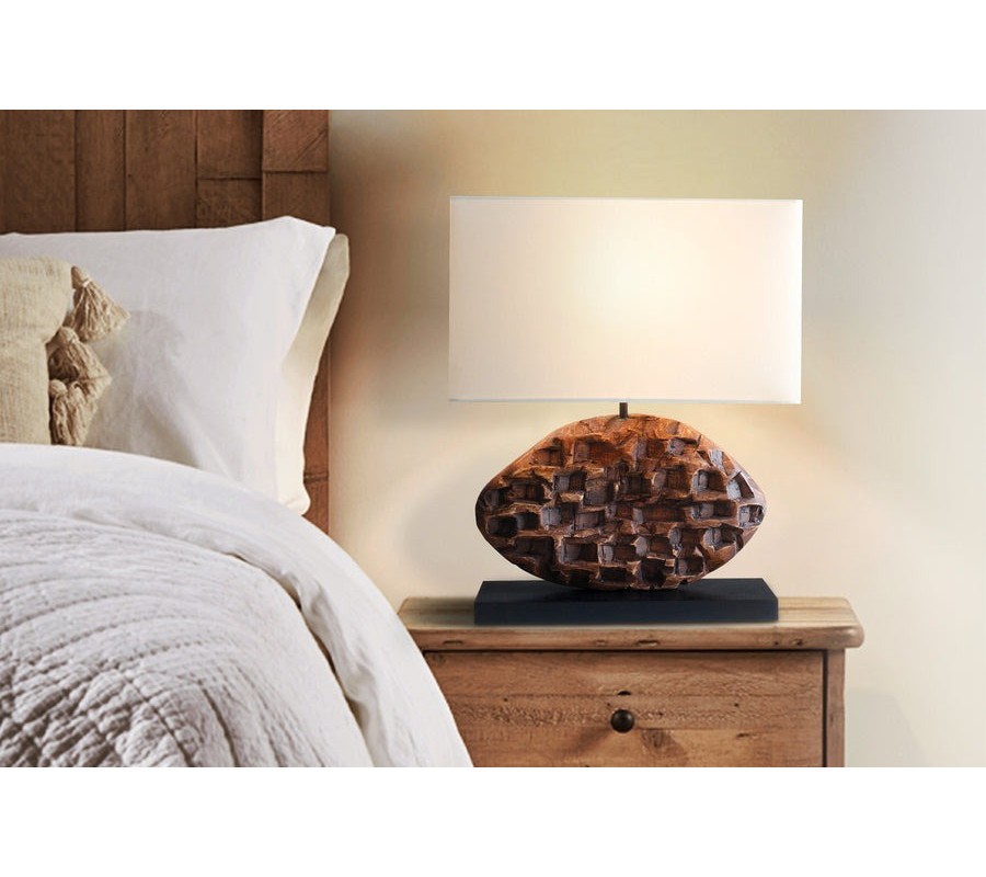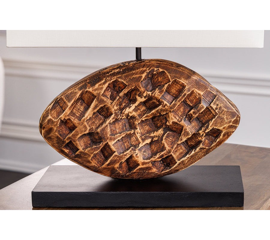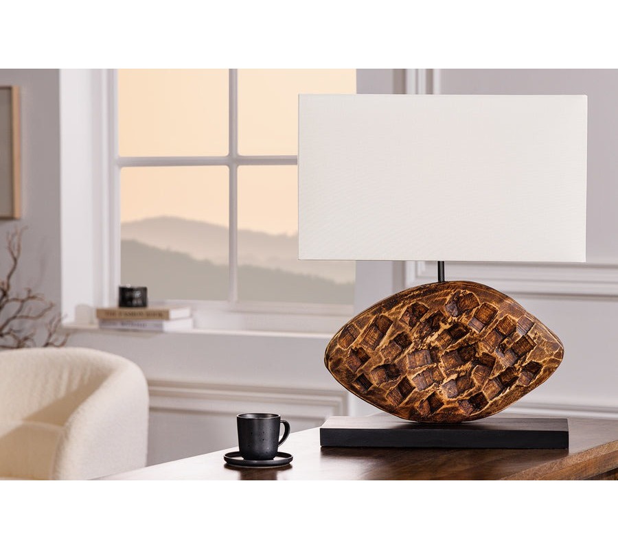 Vidiecky štýl lampy Selin znamená, že sa skvele hodí do rustikálnych alebo klasických interiérov. Táto nočná lampa nie je len svietidlom, ale aj štýlovým doplnkom, ktorý prinesie do vášho priestoru pohodu a charakter. Osvetlite si svoj domov s eleganciou nočnej lampy Selin so zdobeným podstavcom z masívu a užívajte si príjemné svetlo v unikátnom štýle. Dekor z teakového dreva je vyrezávaný a tým dodáva lampe prírodný a hravý vyzuál.