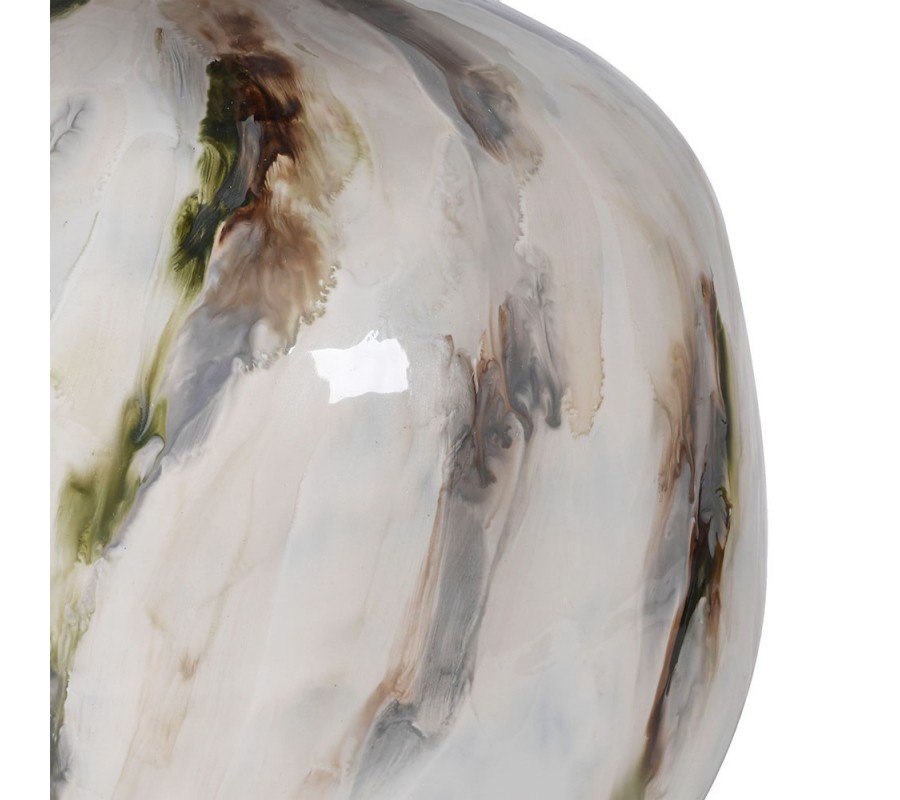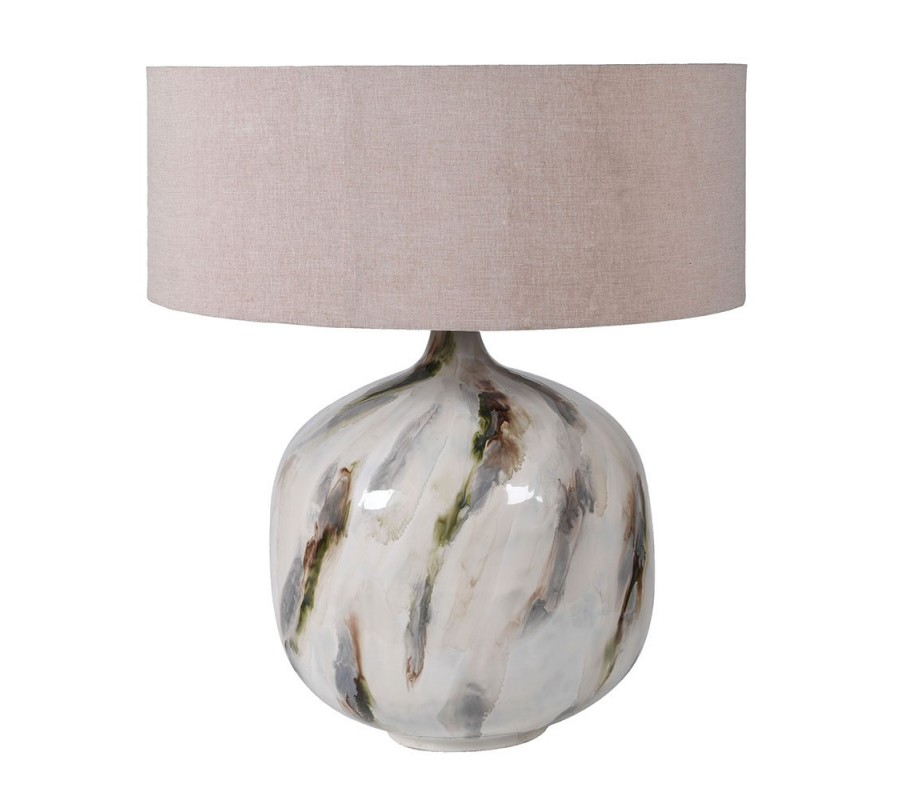 Štýlová kovová lampa má výrazný, guľatý podstavec, ktorý zaujme svojou dekoratívnou povrchovou úpravou. Povrch podstavca je pokrytý jemnými farebnými ťahmi, ktoré sa prelínajú v odtieňoch bielej, šedej, zelenej a hnedej, čo vytvára dojem umeleckého diela s prírodným nádychom. Lesklý povrch kovu odráža svetlo a pridáva lampe luxusný vzhľad, pričom náhodné farebné prechody pôsobia ako abstraktná krajina, pripomínajúca pokojný les alebo zahmlenú prírodu. Tienidlo lampy je vyrobené z mäkkej ľanovej textílie v béžovom odtieni, ktorý perfektne kontrastuje s umeleckým podstavcom. Jeho veľký, valcovitý tvar zaručuje rovnomerné a rozptýlené osvetlenie, čím vytvára v priestore teplú a príjemnú atmosféru. Jemný odtieň textílie harmonizuje s prírodnými farbami podstavca, takže lampa nepôsobí rušivo, ale naopak, pridáva priestoru elegantný a vyvážený dojem.