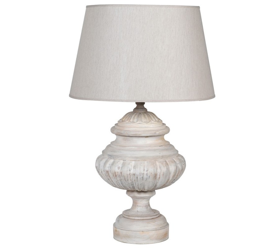 Stolová vintage lampa má klasický oblý tvar s dominantnou robustnou základňou zdobenou jemnými rytinami a rebrovaným vzorom. Tienidlo má valcovitý tvar a je vyrobené z ľanového materiálu, ktorý vytvára príjemnú textúru a jemne prepúšťa svetlo. Základňa je z mangového dreva so svetlou povrchovou úpravou v prírodnom tónovaní, ktoré pôsobí mierne ošúchane, čím sa pridáva dojem patiny a vintage vzhľadu. Vyrezávania na základni dodávajú tradičný a rustikálny šarm.